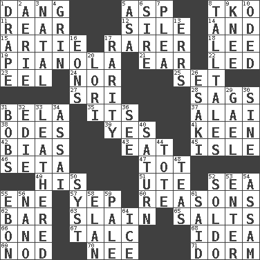 ACROSS 1. Mild oath, euphamism for damn 5. Cleo's killer 8. Ring climax 11. Tail end 12. Filth; sediment 14. Also 15. Nick name for Arthur 17. Less widely known 18. Area sheltered from the wind 19. Player piano 21. Ewer handle 22. Directed 23. Snakelike fish 24. Or not 25. Put into a specified state 27. Indian title of respect (Mr.) 28. Settles 31. Actor Lugosi 35. ___ a Wonderful Life 37. Mountain range southwest of Kyrgyzstan 38. Lyric poems 39. Consenting reply 41. Peachy ____! 42. Prejudice 43. Ingest 45. Capri or Wright 46. Bristle 47. Small child 49. Part of HMS, perhaps 51. Shoshoni 52. Ocean 55. Compass dir. 57. Slangy assent 60. Thinks logically 62. Soap unit 63. Killed 65. Table seasonings 66. Single 67. Baby powder 68. The main thing one is thinking about 69. Allow head to fall sleepily 70. Born 71. Dormintory (informal) DOWN 1. Window treatment 2. Nest on high 3. Brizilian seaport 4. Broad smile 5. White ___ sheet 6. The founder of a family 7. Entreaty 8. Baron Munchausen's specialties 9. Leg joint 10. Wrote a lyric poem 13. Blunders 16. Immeasurably long periods of time 17. Noteworthy scarcity 20. Australian parrot (variant) 26. 1973 Nobel Price Winner (Physics) Leo 29. Highlander 30. Trig term 31. Moves up and down 32. Singer Brickell 33. Resembling or made to resemble leather 34. Slender Brazilian palm 36. Perceive with the eye 40. Titan orbits this 44. Lug 48. Afternoon social gatherings 50. System (abbr.) 52. Twentieth part of a lira 53. Keyboard key 54. Indian state 55. Inky black, to poets 56. Billionth: prefix 58. Style 59. Light colored 61. Stated 64. Frozen water