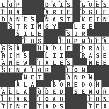 ACROSS 1. Trim (branches) 4. Raised platform 8. Travels 12. Period 13. Johnson of "Laugh-In" 14. Stare 15. Natives or inhabitants of Denmark 18. Political cartoonist Thomas 19. Distinctive style or manner 20. Slender, wiry 22. Area sheltered from the wind 23. Filth; sediment 24. Title for a knight 25. Greek goddess of the dawn 26. Normal relaxed breathing 30. Girls' org. (abbr.) 33. White Person, in Hawaii 36. Relating to the mouth 37. Basketball hoops 39. Cards in a Roman deck? 40. To erase 41. Afresh 42. Lies 44. Born 45. Legislator 47. Period of immesurable duration 50. Fish or hair follower 51. Soon (poet.) 53. Insect wing 54. Mood resulting from idleness 57. Silent film actress Nazimova 59. Wrote a lyric poem 61. Sir (Sp.) 63. Path through which fluid escapes 64. Frog relative 65. Begley and Asner 66. Prong on a fork 67. Small boys 68. John Ritter's dad DOWN 1. Directed 2. Mouths or openings 3. Leg coverings 4. Mild oath, euphamism for damn 5. Like ___ of sunshine 6. ___ a Wonderful Life 7. Arrange properly for use 8. State head 9. Double curve, resembling the letter S 10. Connecticut Ivy Leaguer 11. Elected rep. 16. 4th largest of the Great Lakes 17. Grain storage tower 21. Delicate 22. Mouth edge 24. Institute legal proceedings 26. Writer Wiesel 27. Northwest Algerian city 28. Relaxation 29. Toward shelter 30. Pate de foie ____ 31. Trig term 32. So be it 34. Having or resembling wings 35. Petroleum 38. Tchaikovsky ballet 42. Small child 43. Shrivel 46. Afternoon social gathering 48. Washington bills 49. Thickened enlargement 52. Music written for nine 53. ____ Jay Lerner 54. Necklace unit 55. Probability 56. Method 57. The first octave above the treble staff 58. Luau accessory 59. Baseball player Mel 60. ___ good deed 62. Acura sports coupe