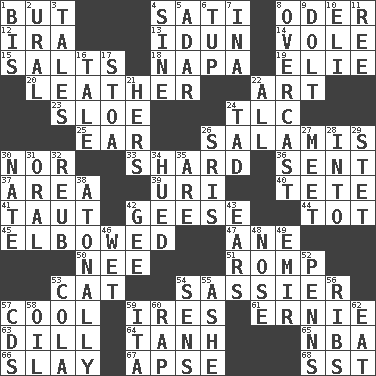 ACROSS 1. On the contrary 4. Suttee (variant) 8. Baltic tributary 12. Lyricist Gershwin 13. Goddess of spring and wife of Bragi 14. Short-tailed, large-bodied rat 15. Table seasonings 18. California wine valley 19. Writer Wiesel 20. Cordwainer's material 22. Tate display 23. _ gin 24. Affectionate concern, for short 25. Ewer handle 26. Deli grouping 30. And not 33. Broken piece 36. Emitted 37. Length times width 39. RI univ. 40. Wig 41. Pulled tight 42. Honkers 44. Small child 45. Turned at an angle; bent 47. One (Scot) 50. Born 51. Play 53. Domesticated feline 54. More lively and spirited 57. Calm and collected 59. Angers 61. Bert's buddy 63. Deli pickle 64. Hyperbolic tangent 65. Basketball assoc. 66. Kill 67. Domed church section 68. Fast jet (abbr.) DOWN 1. Twice 2. Mountain range 3. Stories 4. Trig term 5. The sixth month of the Jewish calendar 6. Uncastrated adult male sheep 7. _ tizzy (2 wds.) 8. Cloudy 9. Stupid person 10. Biblical high priest 11. To riddle 16. Falsehood 17. Portico 21. Possessive pronoun 22. 100% 24. Small amount or degree 26. Indian titles of respect 27. Confront 28. To the inside or interior of 29. Proofreading order 30. Nathan's nickname 31. Relating to the mouth 32. Reuben's nickname 34. Took on color 35. "We ___ not amused" (Victoria) 38. Lacking a tonal center or key 42. Unit of force equal to gravity 43. Hearing organs 46. Soggy 48. Characteristic smell of wine 49. Independent ruler or chieftain 52. Actor Sean's family 53. Root beer relative 54. Elected reps. 55. American tennis player Robert 56. Teases 57. Music discs 58. Petroleum 59. Call ___ day 60. Reproach for some lapse or misdeed 62. Consume