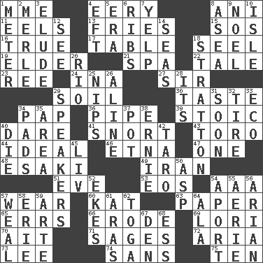 ACROSS 1. Madame (abbr.) 4. Suggestive of the supernatural 8. Cuckoo 11. Snakelike fish 13. Strips of potato fried in deep fat 15. Distress signal 16. Loyal 17. Eating place 18. Sew up the eyelids of hawks and falcons 19. A person who is older than you are 21. Health resort 22. Story 23. To sift 24. _ tizzy (2 wds.) 27. Title for a knight 29. Land 30. Clothes sense 34. Infant food 36. Corncob 39. Unemotional 40. Have the gumption 41. Derisive sound 43. "Corrida" creature 44. Standard of perfection 46. Inactive volcano in Sicily 47. Single 48. 1973 Nobel Price Winner (Physics) Leo 49. SW Asia republic 51. First lady 53. Greek goddess of the dawn 54. Auto club (abbr.) 57. Put on (as clothing) 60. Krazy ___ of comics 63. Some stationery 65. Blunders 66. Eat (away) 69. Australian parrot (variant) 70. Small island 71. Gurus 72. Operatic vocal solo 73. Area sheltered from the wind 74. Without 75. "___ Little Indians" DOWN 1. Distance measurement 2. Haggard of country music 3. Evade 4. Lizard (obsolete) 5. Period 6. Teases 7. Sharp bark 8. At sea 9. Christmas carol 10. Small island 12. Observe 14. Oceans 18. Ski resort town in Vermont 20. _ de Janeiro 25. Cuts off 26. Place in a line 28. ___ a Wonderful Life 29. Orators 31. Within a short period 32. Become fatigued 33. Environmental prefix 34. Groovy apts. 35. Type of rug 37. Plant holder 38. Bert's buddy 40. Pass on 42. Edible starchy tuberous root 45. 54 in ancient Rome 50. Viper 52. Makes supply last 54. To the left, to Queeg 55. Nest on high 56. Believer in; advocate of (suffix) 57. Welt 58. 4th largest of the Great Lakes 59. Johnson of "Laugh-In" 61. Ancient river in northeast Turkey 62. Ancient Roman robe 64. In the manner of 67. Lair 68. Curvy letter