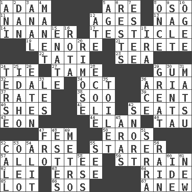 ACROSS 1. First of billions? 5. "We ___ not amused" (Victoria) 8. Bear (Spanish) 11. Nanny 12. Ripens 13. Tired old horse 14. Sillier 17. One of the two male reproductive glands 19. Poe poem 21. Cylindrical with tapered ends 22. Jacques of French films 23. Ocean 24. Make a knot 27. Not wild 29. Chewing product 32. Peak District village in England 34. Sep. follower 36. Operatic vocal solo 37. Assign a rank or rating to 38. "Barney Miller" actor Jack 39. Penny 40. "______ My Girl" (Turtles hit) 41. Connecticut Ivy Leaguer 42. Theater features 43. Period of immesurable duration 44. Flair 46. The 19th letter of the Greek alphabet 47. Opposite of masc. 50. Greek god of love 52. Unrefined 55. A viewer who gazes fixedly 57. One to whom something is allotted 59. Put through a sieve 62. Luau accessory 63. Celtic language 64. Travel on an animal 65. Car dealer's back yard 66. Mayday 67. Afresh DOWN 1. Cuckoo 2. Daniel's nick name 3. Of or related to the anus 4. French painter Edouard 5. Ripen 6. Musical pauses 7. First name in cosmetics 8. Single time 9. Table seasoning 10. Double curve, resembling the letter S 12. Had dinner 15. Maternal 16. Roll call or roster of names 18. Retirement account (abbr.) 20. Full of chinks, cracks, or crevices 24. Laconic 25. Potato state 26. Consumed 28. Learning spot: Fr. 29. Relatively large 30. National forest in Provo, Utah 31. Taiwanese island in East China Sea 33. French article 35. Bathroom plumbing fixture 36. Adept person 42. Derisive sound 45. Caspian sea tributary 47. Back 48. _____ Park, CO 49. Paris' subway 51. Father Junipero _ 52. Give a ring to 53. Butter sub 54. Set down 55. Observe 56. Water falling in drops from the sky 58. Curvy letter 60. Binary compound 61. ___ Haven, CT