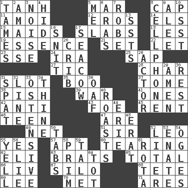 ACROSS 1. Hyperbolic tangent 5. Spoil 8. Head covering 11. Mine, in Marseilles 12. Greek god of love 14. Raised railways 15. Women servants 17. Broad, flat, thick pieces 18. French article 19. Center 21. Put into a specified state 22. Allow 23. Compass dir. 24. Lyricist Gershwin 25. Plant excrement 27. Nervous spasm 28. Burn to charcoal 31. Groove 35. Oct. 31 cry 37. Heavy book 38. Expression of disdain 39. Armed conflict 41. Singles 42. Opposed to 43. Enemy 45. Monthly bill 46. Adolescent 47. "We ___ not amused" (Victoria) 49. Fish or hair follower 51. Title for a knight 52. Lion 55. Consenting reply 57. Fitting 60. Pulling into pieces 62. Biblical high priest 63. Naughty children 65. "_____ Recall" 66. 54 in ancient Rome 67. Grain storage tower 68. Wig 69. Area sheltered from the wind 70. Was introduced to 71. Ancient Greek god of war DOWN 1. Softens 2. Collect or gather 3. Annoying sound 4. Flintstone garb 5. Cartoonist voice _ Blanc 6. Caspian sea tributary 7. Loose flowing garment 8. Portable communications device 9. Toward shelter 10. Inconspicuous attention getter 13. Fast planes 16. In a ____ (agitated or irritated) 17. Manatee 20. Baby bed with high sides 26. Thespian 29. So be it 30. Remainder 31. Petty quarrel 32. Actor's bit 33. Clearly or manifestly demonstrative 34. One or ones belonging to thee 36. Clumsy lout 40. Ridicules or criticizes harshly 44. One of the Great Lakes 48. Part of Q.E.F. 50. Bar bills 52. 61 cubic inches 53. Maternal 54. Stares at amorously 55. Shout 56. Writer Wiesel 58. Demure 59. Story 61. Round or rotation of duties 64. Small child