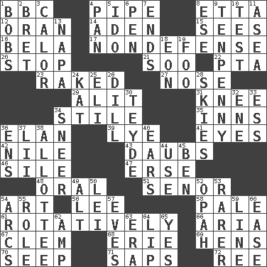 ACROSS 1. English channel? 4. Corncob 8. Singer James 12. NW Algerian seaport 14. An important port of Yemen 15. Perceives with the eye 16. Actor Lugosi 17. Unrelated to defense, as in spending 20. Obstruct or block passage 21. "Barney Miller" actor Jack 22. Parent Teacher Association (abbr.) 23. Swept the length of 27. Olfactory organ 29. Came down and settled, as after flight 31. Leg joint 34. Vertical member of a panel or frame 35. Lodging establishments 36. Liveliness 39. Potassium hydroxide 41. Snake ____ (dice throw) 42. "Death on the ____" 43. Applies to a surface 46. Filth; sediment 47. Celtic language 48. Relating to the mouth 51. Sir (Sp.) 54. Nonscientific branch of learning 56. Area sheltered from the wind 58. Light colored 61. Rotating or pertaining to rotation 66. Operatic vocal solo 67. Clement's nick name 68. 4th largest of the Great Lakes 69. Coop moms 70. Ooze 71. Plant excrements 72. To separate or throw off DOWN 1. Moves up and down 2. Cy Young winner Saberhagen 3. Bodily heat indicating an inflammation 4. Baking dish 5. Wedding promise 6. Fenced enclosure 7. Extremities 8. Compass dir. 9. 3-inch nail 10. Trial 11. Toward the sea 13. California wine valley 18. Age 19. Egg _ yung 24. Krazy ___ of comics 25. Connecticut Ivy Leaguer 26. Deli pickle 28. Atmospheres 30. Miss Universe 1986, Barbara Palacios _ 32. Compass dir. 33. Curvy letter 34. Contemptuous expression 36. Followers of ems 37. Cards in a Roman deck? 38. One to whom something is allotted 40. Hearing organs 44. Purpose 45. Benjamin's nick name 49. Keyboard modifier key 50. Flowery wreath 52. Brightly colored fish 53. More uncommon 54. Arches 55. Hero or heavy, e.g. 57. Nights before holidays 59. Actor's bit 60. Relaxation 62. Electrical Unit 63. Epoch 64. Mouth edge 65. It is so