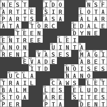 ACROSS 1. A home for chicks 5. Wedding promise 8. Science/research agcy. 11. Nick name for Arthur 13. Title for a knight 14. Globular water bottle used in Asia 15. Actors' quests 16. White ___ sheet 17. Having or resembling wings 18. _ moment's notice (2 wds.) 19. Torque (variant) 21. Peak District village in England 22. Adolescent 24. Centimeter-gram-second unit of force 25. Main course 27. Flowery wreath 29. Soon (poet.) 30. National forest in Provo, Utah 32. Painter Guido (1575-1642) 33. Flower holders 35. Wise men 39. Dodge 41. Collude with 42. It would 43. Annoying sounds 45. Southern CA. univ. 48. Billionth: prefix 49. Lag or linger behind 50. Crow sounds 52. Allow 55. Lip ointment 56. French article 57. Evade 59. Portico 60. "We ___ not amused" (Victoria) 61. Locates 62. For each 63. Parent Teacher Assoc. 64. Gouge DOWN 1. California wine valley 2. Part of Q.E.F. 3. Ski resort town in Vermont 4. Teat (slang) 5. Astrian river, tributary to the Danube 6. Plate 7. Mouth or opening 8. Pitcher Ryan 9. Having lost freshness 10. Conductor's collection 12. First name in cosmetics 14. Kenny Rogers chart-topper in '80 20. Single 21. Prepare for publication 23. Bert's buddy 25. Hearing organ 26. Compass dir. 27. Whopper 28. Followers of ems 30. Purpose 31. With great haste 33. Large container 34. Increase 36. Utter; complete 37. Unit of force equal to gravity 38. It is 40. Small bottle 43. Compass dir. 44. Fertile tracts in a desert 45. A salt of uric acid 46. Bodily heat indicating an inflammation 47. Pale green bean 49. Cook's measure (abbr.) 50. Sure thing 51. At sea 53. Paradise 54. Trial 56. Pet locale 58. Flaplike covering