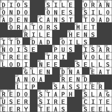 ACROSS 1. "Vaya con ____" 5. Filth; sediment 9. Northwest Algerian city 13. Southwest Nigerian state 14. Washington bills 15. Grain storage tower 16. An important port of Yemen 17. 2nd pers. sing. pres. of can (arch.) 18. Frog relative 19. Speakers 21. Was introduced to 22. Cause heat under the collar 23. Coop moms 24. It would 27. June honoree 28. Lubricates 29. Annoying sound 31. Suppuration 32. Astrian river, tributary to the Danube 36. Woody plant 37. Three (prefix) 38. Grand slam 39. Farming town in central California 40. Born 41. Makes a sale 42. Small, secluded valley 44. Heredity factor (abbr.) 46. Consume 47. Small Philippine buffalo 48. Tear apart 50. Mouth edge 51. More lively and spirited 54. Do over again 56. Staphylococcus 58. Volcanic refuse 60. One who makes use of a thing 61. The founder of a family 62. Quote 63. Suggestive of the supernatural 64. Afternoon social gatherings 65. Stitch closed the eyes of (a falcon) DOWN 1. ___ good deed 2. _ china 3. Baltic tributary 4. Underwater navigation system 5. Flew 6. Taverns 7. French article 8. Eastern Standard Time (abbr.) 9. Clearly or manifestly demonstrative 10. Debaucheries 11. In the manner of 12. Lower and raise head in agreement 17. Root beer relative 20. Event that recurs at intervals 21. Cartoonist voice _ Blanc 23. Part of HMS, perhaps 24. International (abbr.) 25. "Corrida" creature 26. Passed on 28. Fr. "Yes" 30. Signiory (variant) 31. Before (prefix) 33. Not divided or shared with others 34. Silent film actress Nazimova 35. Take ten 37. Nine, plus one 40. Teachers' org. 41. Without 43. Trim (branches) 44. Window treatments 45. Delicate 47. Tree or shrub in the Birch family 49. Flat circles 51. "Two Mules for Sister ____" 52. Writer Wiesel 53. Assign a rank or rating to 54. Regret 55. Compass dir. 56. Fast jet (abbr.) 57. Make a knot 59. Set