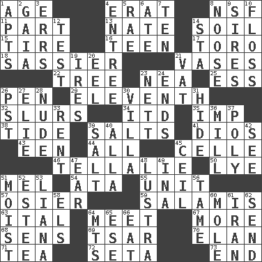 ACROSS 1. Ripen 4. Part of Q.E.F. 8. Science/research agcy. 11. Piece 13. Nathan's nickname 14. The visible part of the earth's surface 15. Become fatigued 16. Adolescent 17. "Corrida" creature 18. More impudent 21. Flower holders 22. Woody plant 23. Teachers' org. 25. Curvy letter 26. Fenced enclosure 29. Veterans Day date 32. Runs notes together 34. It would 35. Naughty child 38. Event that recurs at intervals 39. Table seasonings 41. "Vaya con ____" 43. Car or cant ending 44. Everything 45. Cell (Danish) 46. Copy Pinocchio 50. Potassium hydroxide 51. Cartoonist voice _ Blanc 54. "One Day ___ Time" 55. A single undivided whole 57. Flexible twig of a willow tree 59. Deli grouping 63. Slanted text style (abbr.) 64. Confront 67. Greater amount 68. Elected reps. 69. Russian ruler of old 70. Enthusiasm 71. Beverage made from leaves 72. Stalk of a moss capsule 73. Conclude DOWN 1. Tenement units (abbr.) 2. Greek goddess of the earth (variant) 3. Blunders 4. Main course 5. Actress Charlotte 6. Had dinner 7. Nine, plus one 8. Trap for birds or small mammals 9. Begets 10. Soft thread for cleaning between teeth 12. Trial 14. R.R. building 19. Angers 20. Snakelike fish 21. Large container 23. Remaining after all deductions 24. Extremities 26. Pacific Standard Time (abbr.) 27. Writer Wiesel 28. Unadorned 30. Country estate 31. Flintstone garb 33. Monthly bill 36. Place where flour is made 37. More than one (prefix) 39. Table seasoning 40. Silent film actress Nazimova 42. Perceive with the eye 45. To provide with a ceiling 47. Hearing organ 48. A period of five years 49. _ tizzy (2 wds.) 51. Wet 52. First name in cosmetics 53. Climbing, woody, usually tropical vines 56. Docile 58. Raised railways 60. Undercover agent 61. SW Asia republic 62. Transmit 64. Mountains (abbr.) 65. Compass dir. 66. Ingest