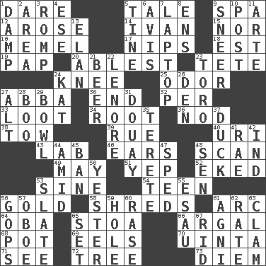 ACROSS 1. Have the gumption 5. Falsehood 9. Health resort 12. Came up 14. "Terrible" tsar 15. Not either 16. Klaipeda city 17. Pinches, bites 18. Eastern Standard Time (abbr.) 19. Infant food 20. Most capable 23. False hair 24. Leg joint 25. Scent 27. Swedish rock group 30. Conclude 32. For each 33. Plunder 34. Carrot, for example 36. Dreamland 38. Pull behind 39. Sorrow 40. RI univ. 43. Experiment locale 46. Hearing organs 48. Examine minutely or intensely 49. Can I? 51. Slangy assent 52. Made supply last 53. Trig term 54. Adolescent 56. Aureate 58. Fragments 61. Curve 64. Chief or king in Benin or Nigeria 65. Portico 66. Therefore, facetiously 68. Cooking vessel 69. Snakelike fish 70. National forest in Provo, Utah 71. Observe 72. Family _ (genealogy) 73. South Vietnam president (1954) DOWN 1. Moist 2. Length times width 3. Frolic 4. Compass dir. 5. Prong on a fork 6. Opinion 7. Portable computer 8. Followers of ems 9. Contemptuous expression 10. Mail 11. Johnson of "Laugh-In" 13. Liveliness 21. Fermented drink made from hops 22. Poe poem 23. "Corrida" creature 24. Krazy ___ of comics 26. Lair 27. Keyboard modifier key 28. Surprise greeting 29. Soup holder 31. A city in N France, SE of Calais 35. Cylindrical with tapered ends 37. Evade 41. Actress Charlotte 42. Working for oneself (abbr.) 44. Among 45. Bar 47. Drove too fast 48. Elected rep. 50. Last 53. Schedule 55. Son of Isaac 56. Republicans 57. Mitch Miller's instrument 59. Hollow 60. To erase 61. Hindu god of fire 62. Pace 63. Dollar (slang) 65. Put into a specified state 67. To free from