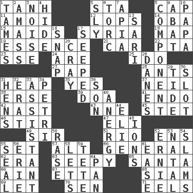 ACROSS 1. Hyperbolic tangent 5. R.R. building 8. Head covering 11. Mine, in Marseilles 12. Chops off 14. Chief or king in Benin or Nigeria 15. Unmarried girls 17. Damascus' land 18. Atlas unit 19. Gist 21. Automobile 22. Parent Teacher Association (abbr.) 23. Compass dir. 24. "We ___ not amused" (Victoria) 25. Wedding promise 27. Infant food 28. Pismires 31. Pile 35. Affirmative reply 37. Famous astronaut Armstrong 38. Celtic language 39. ___ good deed 41. Inside; within (prefix) 42. Political cartoonist Thomas 43. Compass dir. 45. Proofreading order 46. Use a swizzle stick 47. Connecticut Ivy Leaguer 49. Title for a knight 51. River (Sp.) 52. Followers of ems 55. Put into a specified state 57. The first octave above the treble staff 60. Commissioned military rank 62. Epoch 63. Oozy 65. Before Barbara or Clara 66. The 18th letter of the Arabic alphabet 67. Singer James 68. Thailand, formerly 69. Allow 70. Elected rep. 71. Snakelike fish DOWN 1. Corrects by punishment or discipline 2. Collect or gather 3. Annoying sound 4. Flintstone garb 5. Cunning 6. Torque (variant) 7. Capital of Western Samoa 8. Piece 9. Blind as ____ 10. Dad 13. Indian skirt 16. Fastener 17. Oozed 20. Supercomputer manufacturer 26. Natives or inhabitants of Denmark 29. Event that recurs at intervals 30. Notch 31. Coop moms 32. Part of Q.E.F. 33. Aide 34. _ dish (used to culture cells) 36. Male offspring 40. Disorder of the immune system 44. Writer Wiesel 48. Charged particles 50. Raze (variant) 52. Bert's buddy 53. Brizilian seaport 54. Shuts with force 55. Lick closed 56. One of the Great Lakes 58. Allows 59. False hair 61. Comfort 64. Baking dish
