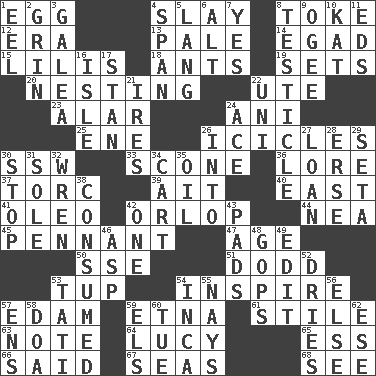 ACROSS 1. Ovum 4. Kill 8. Casino tip 12. Epoch 13. Diluted with white 14. Mild oath 15. Ms. Damita and namesakes 18. Pismires 19. Puts into a specified state 20. Inhabiting a nest 22. Shoshoni 23. Having or resembling wings 24. Black tropical American cuckoo 25. Compass dir. 26. Winter's stalactites 30. Compass dir. 33. Biscuitlike quick bread 36. Old wives' tales, e.g. 37. Torque (variant) 39. Small island 40. 90 degrees 41. Butter sub 42. Lowest deck of a ship 44. Teachers' org. 45. Pre-World Series prize 47. Mature 50. Compass dir. 51. Texas town _ City 53. Uncastrated adult male sheep 54. Heighten or intensify 57. Dutch treat 59. Inactive volcano in Sicily 61. Vertical member of a panel or frame 63. Brief written record 64. "I Love _" 65. Double-curved letter 66. Alleged 67. Oceans 68. Perceive with the eye DOWN 1. Snakelike fish 2. Broad smile 3. An organ shaped like a helmet 4. Connect, as a bridge 5. Long (Scottish) 6. The first octave above the treble staff 7. Consenting reply 8. A testis 9. Double curve, resembling the letter S 10. Krazy ___ of comics 11. Begley and Asner 16. Capri or Wright 17. Comedian Laurel of Laurel & Hardy 21. Angers 22. University (slang) 24. Adept person 26. To the inside or interior of 27. Grant temporary use of 28. Celtic language 29. Bristle 30. Halt 31. Flatfish 32. Songbird 34. Heavy open wagon 35. Lubricate 38. Ingested 42. Single 43. Groovy apts. 46. Cleo's killer 48. Republicans 49. Prepare for publication 52. Frees from moisture 53. Jacques of French films 54. South American Indian 55. Negative votes 56. Otherwise 57. Followers of ems 58. ___ good deed 59. Raised railways 60. Third day of the wk. 62. Compass dir.