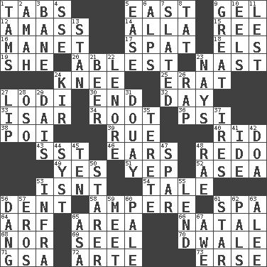 ACROSS 1. Bar bills 5. 90 degrees 9. Set 12. Collect or gather 14. Silent film actress Nazimova 15. Portuguese money of account (variant) 16. French painter Edouard 17. Petty quarrel 18. Raised railways 19. A female animal or person 20. Most capable 23. Political cartoonist Thomas 24. Leg joint 25. Part of Q.E.F. 27. Farming town in central California 30. Conclusion 32. 24 hours 33. Astrian river, tributary to the Danube 34. Carrot, for example 36. 23rd letter of the Greek alphabet 38. Luau course 39. Regret 40. To free from 43. Fast jet (abbr.) 46. Hearing organs 48. Redecorate 49. It is so 51. Slangy assent 52. At sea 53. Is not 54. Lie 56. Gouge 58. Electrical Unit 61. Health resort 64. Sandy's bark 65. Length times width 66. Brizilian seaport 68. Not either 69. Stitch closed the eyes of (a falcon) 70. A sleeping potion; an opiate (poet.) 71. Girls' org. (abbr.) 72. Johnson of "Laugh-In" 73. Celtic language DOWN 1. Scottish caps 2. Nanny 3. Object of repulsion 4. Compass dir. 5. Comfort 6. High mountains 7. Scheduled 8. Make lace 9. Relatively large 10. Snakelike fish 11. For fear that 13. Comedian Laurel of Laurel & Hardy 21. Fermented drink made from hops 22. Poe poem 23. Negative votes 24. Apertif with cassis 26. Hit sharply and swiftly 27. Mouth edge 28. Bear (Spanish) 29. Raised platform 31. A city in N France, SE of Calais 35. Cigar-shaped 37. Angers 41. Binary compound 42. ___ good deed 44. System (abbr.) 45. "___ Little Indians" 47. Practice fight 48. Actress Charlotte 50. A viewer who gazes fixedly 53. Kind of red light 55. Grant temporary use of 56. Mild oath, euphamism for damn 57. Greek god of love 59. Rendezvous 60. Diluted with white 61. Play the lead 62. Friends 63. Toward shelter 65. White ___ sheet 67. Deep reverence
