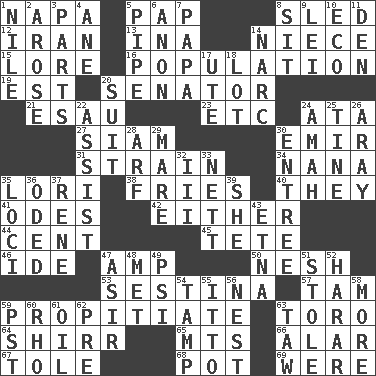 ACROSS 1. California wine valley 5. Infant food 8. Downhill vehicle 12. SW Asia republic 13. _ tizzy (2 wds.) 14. Sibling's daughter 15. Old wives' tales, e.g. 16. Census information 19. Eastern Standard Time (abbr.) 20. Elected representative 21. He sold his birthright 23. And so on (abbr.) 24. _ moment's notice (2 wds.) 27. Thailand, formerly 30. Independent ruler or chieftain 31. Put through a sieve 34. Nanny 35. Australian parrot (variant) 38. Strips of potato fried in deep fat 40. Those people 41. Lyric poems 42. One or the other of two 44. Penny 45. False hair 46. Binary compound 47. Electrical Unit 50. Tender 53. French poetic form 57. Scottish cap 59. Appease 63. "Corrida" creature 64. Bake eggs in their shells 65. Mountains (abbr.) 66. Having or resembling wings 67. Lacquered or enameled metalware 68. Cooking vessel 69. Past tense of be (plural) DOWN 1. "Death on the ____" 2. Came up 3. Components 4. One (Scot) 5. Corncob 6. At once, immediately (arch.) 7. Dad 8. Be seated 9. Flowery wreath 10. Environmental prefix 11. Lair 14. Drug cop 17. Shoshoni 18. Car dealer's back yard 20. Set or collection 22. Help 24. Nanny 25. Prong on a fork 26. Like ___ of sunshine 28. Sandy's bark 29. Female horse 30. Main course 32. One more than two 33. Remaining after all deductions 35. Locales 36. Wrote a lyric poem 37. French philosopher Descartes 39. A female animal or person 43. Inactive volcano in Sicily 47. SW Saudi Arabia district 48. Was introduced to 49. Air pressure measure (abbr.) 51. Fur scarf 52. Ethiopian city, capital of Harari 54. Pack (down) 55. "Tell ____ the Marines!" 56. A home for chicks 58. Greater amount 59. Pacific Standard Time (abbr.) 60. 17th letter of the Greek alphabet 61. Petroleum 62. Before (prefix) 63. The 23rd letter of the Hebrew alphabet