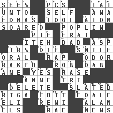 ACROSS 1. Observes 5. Personal Computers (abbr.) 8. Make lace 11. To (old English) 12. Automatically 14. Santa ___, CA 15. Ferber et al. 17. Instrument 18. Tiny particle 19. Flew 21. Cotton for raincoats, e.g. 23. Sliced dessert 25. Part of Q.E.F. 26. A whole individual unit 27. Male parent 28. Viper 31. Big collection agency 33. Expire 35. Grin 37. Of the mouth 38. Hit sharply and swiftly 40. Scent 41. Swept the length of 43. Director Reiner 45. Small moist lump or mass 46. One (Scot) 47. It is so 50. Raze (variant) 52. Queen of England 1702-14 53. Three (prefix) 54. Keyboard key 56. Scheduled 61. Port city in Latvia 62. Prepare for publication 65. Peak District village in England 66. Biblical high priest 67. Painter Guido (1575-1642) 68. Actor Alda or Thicke 69. Raised railways 70. Actress Charlotte 71. Not women's DOWN 1. Takes to court 2. Inside; within (prefix) 3. Inactive volcano in Sicily 4. Fly high 5. Pacific Standard Time (abbr.) 6. Corporate head (abbr.) 7. Slanted 8. Jacques of French films 9. At once, immediately (arch.) 10. Scottish cap 13. Plants 16. Back-to-school mo. 18. The first octave above the treble staff 20. Passed on 22. Writing tablets 24. Arab leader 26. Small island 28. Opera by Verdi 29. Messy guy 30. For each 31. SW Asia republic 32. Libertine 34. Ewer handle 36. Method 37. Mouth or opening 39. Sweet dark-red dessert wine 42. Centimeter-gram-second unit of force 44. Soap units 48. Keyboard key 49. Sowing specialist 51. Drop; flow; fall 52. According to 54. Deli pickle 55. Armor plate that protects the chest 57. First man 58. Falsehood 59. Enthusiasm 60. Cub Scout units 61. Portuguese money of account (variant) 63. _ tizzy (2 wds.) 64. Make a knot