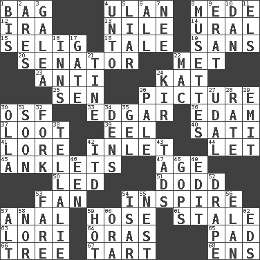 ACROSS 1. Container for groceries 4. Uhlan (variant) 8. Ancient Persian 12. Lyricist Gershwin 13. "Death on the ____" 14. Mountain range 15. Former Milwaukee Brewers owner Bud 18. Falsehood 19. Without 20. Elected representative 22. Was introduced to 23. Against 24. Krazy ___ of comics 25. Elected rep. 26. Photo 30. Order of Saint Francis (abbr.) 33. _ Allan Poe 36. Dutch treat 37. Spoils 39. Snakelike fish 40. Suttee (variant) 41. Old wives' tales, e.g. 42. An arm off of a larger body of water 44. Allow 45. Short socks 47. Personal question 50. Directed 51. Texas town _ City 53. Air blower 54. Motivate 57. Of or related to the anus 59. Flexible conduit 61. Showing deterioration from age 63. Australian parrot (variant) 64. Mouths or openings 65. Writing tablet 66. Family _ (genealogy) 67. Small pie 68. Followers of ems DOWN 1. Again 2. Ancient Greek god of war 3. An organ shaped like a helmet 4. To (old English) 5. One who doesn't tell the truth 6. Everything 7. Born 8. French bagpipes 9. Part of Q.E.F. 10. Daniel's nick name 11. Raised railways 16. Lodging establishments 17. Yard entry 21. Prong on a fork 22. Apple computer (short form) 24. Apertif with cassis 26. Diluted with white 27. Freehold land 28. Pace 29. Send forth 30. Water jar 31. Within a short period 32. Tined utensil 34. Hiding places for outlaws 35. Set 38. Copy Pinocchio 42. It would 43. Small boys 46. Car or cant ending 48. Republicans 49. Prepare for publication 52. Window treatment 53. Conductor's collection 54. Astrian river, tributary to the Danube 55. A home for chicks 56. Style 57. The first octave above the treble staff 58. And not 59. Being at a high temperature 60. Mouth or opening 62. Begley and Asner