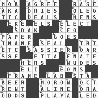 ACROSS 1. Crowd into 4. Match 9. To erase 13. Alias (abbr.) 14. Frees from moisture 15. Butter sub 16. Nervous spasm 17. Allots cards 18. Not women's 19. Make supply last 21. Raised railways 22. Choose 24. Neighbor of Neb. 26. Corporate head (abbr.) 27. Some stationery 29. Travels 30. Silly 31. Lick closed 33. Three (prefix) 36. And so on (abbr.) 37. More lively and spirited 40. Rowing implement 41. Compass dir. 42. Singer James 43. Maternal 45. Possessive pronoun 47. Unadorned figures 48. Biblical high priest 49. Immeasurably long periods of time 50. Movie unit 52. Experiment locale 54. R.R. building 56. Fermented drink made from hops 57. Person of subnormal intelligence 59. Sep. follower 61. Monthly bill 62. Place in a line 63. Mouth or opening 64. Likelihood 65. Beach, in Buenos Aires 66. Directed DOWN 1. Floor protector 2. Migrant worker of the '30s 3. Keyboard key 4. Increase 5. Hellenic 6. Monetary unit of Yemen 7. Snakelike fish 8. Curvy letter 9. Lover boys 10. Actor Baldwin 11. Transmitted 12. Greek goddess of the dawn 20. Locale of original sin 22. Learning spot: Fr. 23. Area sheltered from the wind 25. Ancient Greek god of war 27. Sliced desserts 28. Pismires 29. Greek goddess of the earth (variant) 31. Fast planes 32. Eastern Standard Time (abbr.) 33. Inedible or poisonous agaric 34. Pace 35. Angers 38. Nest on high 39. Western Nevada city 44. Religious women 45. Centers of feelings and intuitions 46. Shade tree 49. Dark wood 50. Nourish 51. Tear apart 52. Hang loosely or laxly 53. Operatic vocal solo 55. 43,560 square feet 56. Sis' sibling 57. Atlas unit 58. Teachers' org. 60. Bit