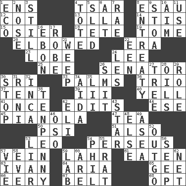 ACROSS 1. Followers of ems 4. Russian ruler of old 8. Son of Isaac 12. Small bed 13. Spanish pot 14. Nuclear Threat Initiatives 15. Flexible twig of a willow tree 18. False hair 19. Heavy book 20. Turned at an angle; bent 22. Period 23. Ear part 24. Area sheltered from the wind 25. Born 26. Legislator 30. _ Lanka 33. Insides of hands 36. Musical group of three 37. Portable shelter 39. One more than two 40. Shout 41. At one time in the past 42. Proofreads 44. Compass dir. 45. Player piano 47. Afternoon social gathering 50. Air pressure measure (abbr.) 51. In addition 53. Lion 54. Son of Zeus who helped slay Medusa 57. Distinctive style or manner 59. Cowardly lion portrayer 61. Eroded 63. _ the terrible 64. Roberta Peters solo 65. Unit of force equal to gravity 66. Suggestive of the supernatural 67. Waist strap 68. Elect DOWN 1. Environmental prefix 2. Characteristic smell of wine 3. Free from disturbance or agitation 4. Lug 5. Downhill vehicle 6. The first octave above the treble staff 7. Actress Charlotte 8. Plea 9. Portico 10. Direct toward a target or goal 11. Purpose 16. Inky black, to poets 17. Loose flowing garment 21. Shed a tear 22. Car or cant ending 24. French article 26. Stricken, poetically 27. Woody plant 28. Lubricates 29. Hero or heavy, e.g. 30. Constrict 31. Painter Guido (1575-1642) 32. South American Indian 34. Opera by Verdi 35. Cards in a Roman deck? 38. 3-inch nail 42. Biblical high priest 43. Play the lead 46. Bear (Spanish) 48. Otherwise 49. Toward the sea 52. Expenditure 53. One who doesn't tell the truth 54. Silvers or Donahue 55. Part of Q.E.F. 56. Ooze 57. Compete 58. Night before a holiday 59. Experiment locale 60. "We ___ not amused" (Victoria) 62. Fish or hair follower