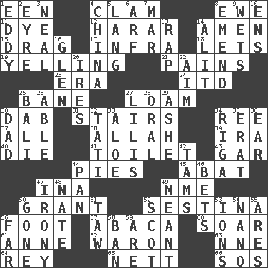 ACROSS 1. Car or cant ending 4. Burrowing marine mollusk 8. She-sheep 11. Color 12. Ethiopian city, capital of Harari 14. So be it 15. To trail on the ground 17. Kind of red light 18. Allows 19. Crying or shouting loudly 21. Aches 23. Epoch 24. It would 25. Object of repulsion 27. Rich soil 30. Pat or tap gently 31. Flight of steps 34. Portuguese money of account (variant) 37. Everything 38. Assad's deity 39. Retirement account (abbr.) 40. Pass on 41. Rest room 43. Slender fish 44. Sliced desserts 45. Blind as ____ 47. _ tizzy (2 wds.) 49. Madame (abbr.) 50. Let have 52. French poetic form 56. One third of a yard 57. Phillipine bananalike plant 60. Fly high 61. Queen of England 1702-14 62. Make _____ (do battle with) 63. Compass dir. 64. Marina Del _, California 65. Remaining after all deductions 66. Distress signal DOWN 1. Whirlpool 2. Jane of fiction 3. Actress Patricia 4. Large country 5. Austrian-born American filmmaker Fritz 6. Sandy's bark 7. Make imperfect 8. Make improvements or corrections to 9. Moistens 10. Followers of ems 13. Strike 14. Came down and settled, as after flight 16. Small, secluded valley 20. Angers 22. Direct toward a target or goal 25. Indonesian resort city 26. Competent 27. Ms. Damita and namesakes 28. Taken by mouth 29. American tennis player Robert 30. June honoree 32. Jacques of French films 33. _ vera 34. Capital of Latvia 35. Part of Q.E.F. 36. Ewer handle 42. Scottish caps 44. Baking dish 46. Stakes 47. Literary sarcasm 48. Nathan's nickname 49. Intended 50. Went 51. The 23rd letter of the Hebrew alphabet 52. Highlander 53. Charged particles 54. Billionth: prefix 55. Ancient Greek god of war 56. Distant 58. Forbid 59. "We ___ not amused" (Victoria)