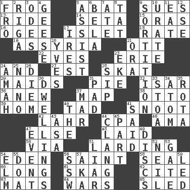 ACROSS 1. Toadlike animal 5. Blind as ____ 9. Institutes legal proceedings 13. Travel on an animal 14. Stalk of a moss capsule 15. Mouths or openings 16. Double curve, resembling the letter S 17. Small island 18. Assign a rank or rating to 19. Nineveh was its capital 21. Baseball player Mel 22. Nights before holidays 23. 4th largest of the Great Lakes 24. Plus 27. Eastern Standard Time (abbr.) 28. Three-handed card game 29. Unmarried girls 31. Sliced dessert 32. Astrian river, tributary to the Danube 36. Afresh 37. Atlas unit 38. "Beetle Bailey" pooch 39. Dwelling 40. Bit 41. Snob 42. Cowardly lion portrayer 44. Tax preparer (abbr.) 46. Housemaid (var.) 47. Otherwise 48. Put down 50. By way of 51. Preparing or cooking with lard 54. Paradise 56. Inhabitant of Heaven 58. Lick closed 60. Yearn 61. Heroin 62. Quote 63. Floor protectors 64. Armed conflicts 65. Downhill vehicle DOWN 1. Away 2. Port city in Latvia 3. Lyric poems 4. Honkers 5. Aid 6. Actor Lugosi 7. Had dinner 8. Make lace 9. Determination 10. A salt of uric acid 11. Ingest 12. Compass dir. 17. Angers 20. Jacques Cousteau's middle name 21. Mouth or opening 23. Supplement with great effort 24. Nanny 25. Billionth: prefix 26. South Vietnam president (1954) 28. Small drink 30. Residences 31. Groovy apt. 33. Portico 34. Tiny particle 35. Round or rotation of duties 37. Impair 40. Definite Article 41. Stated 43. White ___ sheet 44. Rings like a ship's bell 45. Role in a play 47. Happening 49. Flat circles 51. One who doesn't tell the truth 52. Famous astronaut Armstrong 53. Yard entry 54. Shade tree 55. ___ good deed 56. Compass dir. 57. Alias (abbr.) 59. Directed