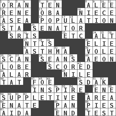 ACROSS 1. NW Algerian seaport 5. "___ Little Indians" 8. Toward shelter 12. French philosopher Descartes 13. Chief or king in Benin or Nigeria 14. Sibling's daughter 15. Toward the sea 16. Census information 19. R.R. building 20. Legislator 21. Indian titles of respect 23. And so on (abbr.) 24. Keyboard modifier key 27. Nuclear Threat Initiatives 30. Writer Wiesel 31. Respiratory problem 34. Short-tailed, large-bodied rat 35. Examine hastily 38. Actors Connery and Penn 40. Age 41. Ear part 42. Tallied 44. Having or resembling wings 45. "Death on the ____" 46. Make lace 47. Enemy 50. Neighbor of Neb. 53. Motivate 57. Compass dir. 59. Supplementary 63. Length times width 64. Related on the mother's side 65. Baking dish 66. Sliced desserts 67. Opera by Verdi 68. Conclusion 69. Trial DOWN 1. Mouths or openings 2. Musical pauses 3. Approach 4. Teachers' org. 5. Drink excessively 6. Inky black, to poets 7. California wine valley 8. Small island 9. Flowery wreath 10. Environmental prefix 11. Car or cant ending 14. Drug cop 17. Shoshoni 18. Car dealer's back yard 20. Fast planes 22. Sillier 24. _ vera 25. _ and Stitch 26. Adolescent 28. It is 29. "______ My Girl" (Turtles hit) 30. Eluded 32. Apple computer (short form) 33. Soon (poet.) 35. Narrow board 36. Root beer relative 37. Blind as ____ 39. Indian title of respect (Mr.) 43. Otherwise 47. Do some clerical work 48. Single 49. Eastern Standard Time (abbr.) 51. Nest on high 52. Leg joints 54. Corncob 55. "Terrible" tsar 56. Tear apart 58. 90 degrees 59. Ocean 60. University (slang) 61. Writing tablet 62. Parent Teacher Assoc. 63. Fitting