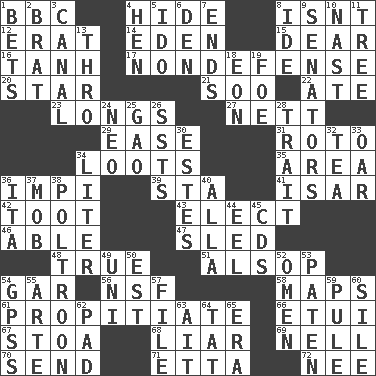 ACROSS 1. English channel? 4. Flintstone garb 8. Is not 12. Part of Q.E.F. 14. Paradise 15. Letter starter 16. Hyperbolic tangent 17. Unrelated to defense, as in spending 20. Play the lead 21. "Barney Miller" actor Jack 22. Had dinner 23. Yearns 27. Remaining after all deductions 29. Comfort 31. Printing process, for short 34. Plunders 35. Type of rug 36. Body of Kaffir warriors 39. R.R. building 41. Astrian river, tributary to the Danube 42. A blast of a horn 43. Opt 46. Competent 47. Downhill vehicle 48. Loyal 51. Columnist Joseph or Stewart 54. Slender fish 56. Science/research agcy. 58. Atlas contents 61. Conciliate 66. Needle case 67. Portico 68. One who doesn't tell the truth 69. 1994 drama film starring Jodie Foster 70. Post 71. Singer James 72. Born DOWN 1. Stakes 2. Naughty child 3. Lessep's creation 4. Layer 5. Wedding promise 6. Lair 7. Conclusions 8. Binary compound 9. Legislators 10. Political cartoonist Thomas 11. Woody plant 13. Through, poetically 18. Period of immesurable duration 19. Enemy 24. Modern: prefix 25. E Mali city 26. Fast planes 28. Distinguishing feature 30. _____ Park, CO 32. Beverage made from leaves 33. Rowing implement 34. 61 cubic inches 36. Call ___ day 37. Disorderly crowd 38. Coward 40. Silent film actress Nazimova 44. Snakelike fish 45. Music discs 49. Single; one (prefix) 50. Eastern Standard Time (abbr.) 52. Sign of things to come 53. Eucharist need 54. Global Positioning Systems (abbr.) 55. Johnson of "Laugh-In" 57. Do some clerical work 59. Whimper 60. Filth; sediment 62. Writing tablet 63. Small island 64. Make lace 65. Epoch