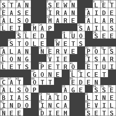 ACROSS 1. Comedian Laurel of Laurel & Hardy 5. Stitched 9. Allow 12. Comfort 13. SW Asia republic 14. Assistant 15. In addition 16. Female horse 17. Having or resembling wings 18. Flowery wreath 19. Atlas unit 21. Travel by water 22. Downhill vehicle 24. Nilotic language 26. Perceive with the eye 27. Fur scarf 28. Soaks 29. ____ Jay Lerner 30. Impudent aggressiveness 32. Cooking vessels 36. Having great length 37. Compete 38. Astrian river, tributary to the Danube 39. Allows 40. Stone: prefix 42. Needle case 43. Went 44. It is permitted: Lat. 46. Domesticated feline 49. Baseball player Mel 50. Genesis locale 51. Columnist Joseph or Stewart 53. Personal question 54. Compass dir. 57. Prejudice 58. Put down 61. Actor's bit 62. Southeast Asian peninsula 63. South American Indian 64. Tending to cause great harm 65. Born 66. South Vietnam president (1954) 67. Arranges properly for use DOWN 1. Lick closed 2. Story 3. Aide 4. Modern: prefix 5. Simple or foolish person 6. Period 7. Armed conflict 8. Compass dir. 9. Ms. Damita and namesakes 10. Peak District village in England 11. Laconic 14. American Automobile Association (abbr.) 19. Cartoonist voice _ Blanc 20. An important port of Yemen 21. Distress signal 23. Yearns 24. Crowbar 25. Shoshoni 27. _ gin 28. Compose 29. 100% 31. Happening 32. Component 33. Clearly or manifestly demonstrative 34. Drawn tight 35. Indian title of respect (Mr.) 40. Plant holder 41. Cassini of fashion 43. Grand Old Party 45. Binary compound 46. Apartment or room in a ship 47. Place in a line 48. Sadhe (variant) 52. Bear (Spanish) 53. First man 55. In a ____ (agitated or irritated) 56. Snakelike fish 58. Hat (slang) 59. Black tropical American cuckoo 60. Frozen water 61. French article