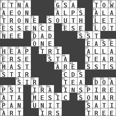 ACROSS 1. Inactive volcano in Sicily 5. Girls' org. (abbr.) 8. Pull behind 11. Age 12. High mountains 14. Insect wing 15. Marketplace scale 17. Compass direction 18. Allow 19. Substance 21. Compass dir. 22. Car dealer's back yard 23. Born 24. June honoree 25. Fast jet (abbr.) 27. Single 28. Comfort 31. Pile 35. Three (prefix) 37. Silent film actress Nazimova 38. Celtic language 39. R.R. building 41. Rend 42. Vertical spar for supporting sails 43. "We ___ not amused" (Victoria) 45. Fast planes 46. Disorderly outburst 47. Music discs 49. Title for a knight 51. Beverage made from leaves 52. ___ good deed 55. Pacific Standard Time (abbr.) 57. Lyricist Gershwin 60. Stimulate to action 62. "One Day ___ Time" 63. Of or pertaining to a meson 65. Underwater navigation system 66. Baking dish 67. A single undivided whole 68. Suttee (variant) 69. Nonscientific branch of learning 70. Big collection agency 71. Woody plant DOWN 1. Consumed 2. Laconic 3. Trap for birds or small mammals 4. Queen of England 1702-14 5. E Mali city 6. Turn sharply 7. Flats, for short 8. Baron Munchausen's specialties 9. Butter sub 10. Electrical Unit 13. "______ My Girl" (Turtles hit) 16. Inside; within (prefix) 17. Spring feasts 20. Patter 26. Theater features 29. Narrow board 30. Hearing organs 31. Is hesitant and indecisive 32. Part of Q.E.F. 33. Aide 34. _ dish (used to culture cells) 36. Call ___ day 40. Northern region 44. Genesis locale 48. Backtalk 50. Tall New Zealand timber tree 52. Middle Eastern gold or silver currency 53. Declaim 54. Nest on high 55. Dad 56. Play the lead 58. Painter Guido (1575-1642) 59. SW Saudi Arabia district 61. Mail 64. It is