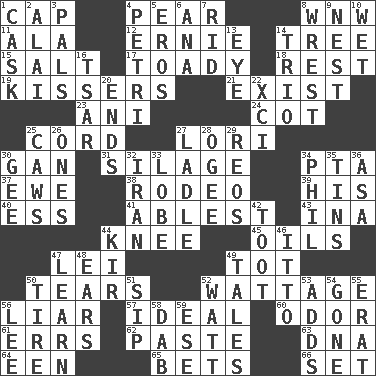 ACROSS 1. Head covering 4. Lightbulb-shaped fruit 8. Compass dir. 11. In the manner of 12. Bert's buddy 14. Family _ (genealogy) 15. Table seasoning 17. Sycophant 18. Remainder 19. Smoochers 21. Have an existence 23. Cuckoo 24. Small bed 25. Drawstring 27. Australian parrot (variant) 30. Separate the seeds from cotton 31. Fodder prepared in a silo 34. Parent Teacher Association (abbr.) 37. She-sheep 38. Cowboy competition 39. Part of HMS, perhaps 40. Curvy letter 41. Most capable 43. _ tizzy (2 wds.) 44. Leg joint 45. Lubricates 47. Luau accessory 49. Small child 50. Separates forcefully 52. Electrical Measurement 56. One who doesn't tell the truth 57. Perfect 60. Aroma 61. Blunders 62. Thick mixture 63. Heredity factor (abbr.) 64. Car or cant ending 65. Wagers 66. Put into a specified state DOWN 1. Keg 2. Jai _ 3. Friends 4. _ dish (used to culture cells) 5. Greek god of love 6. Santa ___, CA 7. To free from 8. Obtain by seizing forcibly or violently 9. A home for chicks 10. Dripping 13. Sight organ 14. Musical group of three 16. Russian ruler of old 20. Extremities 22. One more than ninety 25. Crow sounds 26. Singles 27. Dipping utensil 28. Double curve, resembling the letter S 29. Vintage cars 30. Turn to the right 32. SW Asia republic 33. Ear part 34. Silvers or Donahue 35. Canisters 36. White ___ sheet 42. A blast of a horn 44. Apertif with cassis 46. "Tell ____ the Marines!" 47. Acquire or gain knowledge or skills 48. Hearing organs 49. Lies 50. Hoop that covers a wheel 51. Small drink 52. Electrical Unit 53. Does sums 54. Went 55. Part of Q.E.F. 56. Area sheltered from the wind 58. Small moist lump or mass 59. Compass dir.