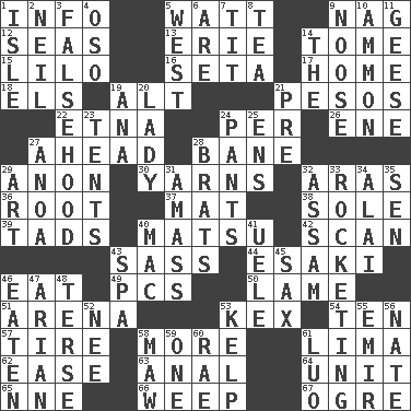 ACROSS 1. A message received and understood 5. Electrical Unit 9. Tired old horse 12. Oceans 13. 4th largest of the Great Lakes 14. Heavy book 15. _ and Stitch 16. Stalk of a moss capsule 17. Residence 18. Raised railways 19. Keyboard modifier key 21. Mexican monetary units 22. Inactive volcano in Sicily 24. For each 26. Compass dir. 27. Toward the future 28. Object of repulsion 29. Soon (poet.) 30. Entertaining tales 32. Caspian sea tributary 36. Carrot, for example 37. Floor protector 38. Not divided or shared with others 39. Bits 40. Taiwanese island in East China Sea 42. Examine hastily 43. Backtalk 44. 1973 Nobel Price Winner (Physics) Leo 46. Erode 49. Personal Computers (abbr.) 50. Unable to walk 51. Sports stadium 53. Dry husk or covering 54. "___ Little Indians" 57. Become fatigued 58. Greater amount 61. Pale green bean 62. Comfort 63. Of or related to the anus 64. A single undivided whole 65. Compass dir. 66. Shed a tear 67. Legendary monster DOWN 1. Capri or Wright 2. Famous astronaut Armstrong 3. It jiggles the polygraph 4. Bear (Spanish) 5. Compass direction 6. "We ___ not amused" (Victoria) 7. Teat (slang) 8. Afternoon social gathering 9. Trap for birds or small mammals 10. ID or VA city 11. Honkers 14. Definite Article 19. Santa ___, CA 20. Kenny Rogers chart-topper in '80 21. Before (prefix) 23. Portable shelters 24. Leg coverings 25. Followers of ems 27. Small Philippine buffalo 28. Naughty children 29. Tate display 31. Collect or gather 32. Indian state 33. Shooting up abruptly 34. Mountain range southwest of Kyrgyzstan 35. Elected rep. 40. Apple computer (short form) 41. Ubangi River tributary 43. Health resort 45. Saxophone 46. Consumed 47. Believer in; advocate of (suffix) 48. Laconic 52. Born 53. Seaweed 55. Independent ruler or chieftain 56. Nathan's nickname 58. Informal term for the mouth 59. Single 60. Actress Charlotte 61. Nilotic language