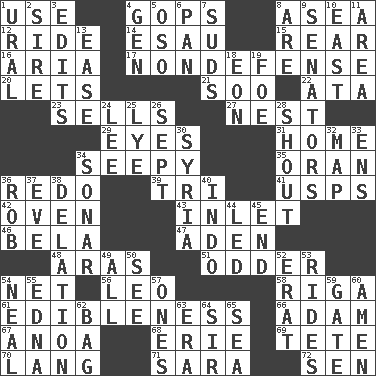 ACROSS 1. Purpose 4. Republicans 8. Toward the sea 12. Travel on an animal 14. Son of Isaac 15. Tail end 16. Operatic vocal solo 17. Unrelated to defense, as in spending 20. Allows 21. "Barney Miller" actor Jack 22. "One Day ___ Time" 23. Makes a sale 27. A home for chicks 29. Sight organs 31. Dwelling 34. Oozy 35. Northwest Algerian city 36. Redecorate 39. Three (prefix) 41. United States Postal Service (abbr.) 42. Baking chamber 43. An arm off of a larger body of water 46. Actor Lugosi 47. Arabian gulf 48. Ancient river in northeast Turkey 51. More peculiar 54. Fish or hair follower 56. Lion 58. Capital of Latvia 61. The property of being fit to eat 66. First of billions? 67. Small Philippine buffalo 68. 4th largest of the Great Lakes 69. Wig 70. Long (Scottish) 71. "Two Mules for Sister ____" 72. Elected rep. DOWN 1. Mountain range 2. Father 3. Prepares for publication 4. Commissioned military rank (abbr.) 5. Bear (Spanish) 6. Baking dish 7. Soap bubbles 8. "We ___ not amused" (Victoria) 9. Legislators 10. 90 degrees 11. Length times width 13. Comfort 18. A really long time 19. Enemy 24. Area sheltered from the wind 25. Potassium hydroxide 26. Back-to-school mo. 28. Yell 30. Damascus' land 32. Atlas unit 33. Followers of ems 34. Underwater navigation system 36. Director Reiner 37. First lady 38. Conveyance 40. Southeast Asian peninsula 44. Directed 45. Conclude 49. Everything 50. Observe 52. Part of Q.E.F. 53. Amusement-park features 54. Actress Patricia 55. Pulitzer Prize-winning author Ferber 57. Washington bills 59. Yard entry 60. So be it 62. Container for groceries 63. Period 64. Title for a knight 65. Ocean