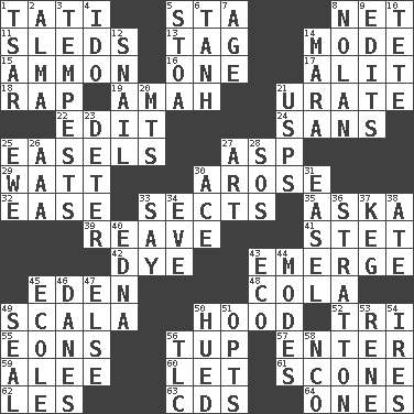 ACROSS 1. Jacques of French films 5. R.R. building 8. Fish or hair follower 11. Bobsleighs 13. Label 14. Method 15. ID or VA city 16. Single 17. Set down 18. Hit sharply and swiftly 19. Wet nurse 21. A salt of uric acid 22. Prepare for publication 24. Without 25. Artist's stands 27. Cleo's killer 29. Electrical Unit 30. Came up 32. Comfort 33. Religious groups 35. "____ silly question..." 39. Rob, plunder, or pillage 41. Proofreading order 42. Color 43. Develop 45. Paradise 48. Root beer relative 49. Any of the three canals of the cochlea 50. Parka part 52. Three (prefix) 55. Immeasurably long periods of time 56. Uncastrated adult male sheep 57. Keyboard key 59. Toward shelter 60. Allow 61. Biscuitlike quick bread 62. French article 63. Music discs 64. Singles DOWN 1. Russian ruler of old 2. _ mater 3. Storms 4. Wedding promise 5. Portico 6. Hyperbolic tangent 7. Mature 8. Pitcher Ryan 9. Proofreads 10. Wig 12. Slow-paced one 14. Hindu Mythology: god of death 20. Mountains (abbr.) 21. United States Postal Service (abbr.) 23. Prevent from occurring 25. She-sheep 26. American Automobile Association (abbr.) 27. Nonscientific branch of learning 28. Mayday 30. Adept person 31. Artist's stand 33. Declare 34. Night before a holiday 36. Ski resort town in Vermont 37. Barrel 38. Had dinner 40. Pulitzer Prize-winning author Ferber 43. Environmental prefix 44. Methods 45. Learning spot: Fr. 46. Natives or inhabitants of Denmark 47. Otherwise 49. Lick closed 50. Became colored 51. Chooses 53. French philosopher Descartes 54. Angers 56. Affectionate concern, for short 58. Non-commissioned officer (abbr.)