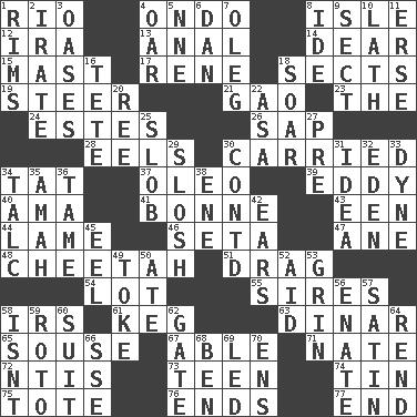 ACROSS 1. _ de Janeiro 4. Southwest Nigerian state 8. Small island 12. Retirement account (abbr.) 13. Of or related to the anus 14. Letter starter 15. Vertical spar for supporting sails 17. French philosopher Descartes 18. Religious groups 19. Bull 21. E Mali city 23. Definite Article 24. _____ Park, CO 26. Plant excrement 28. Snakelike fish 30. Borne 34. Make lace 37. Margarine 39. Whirlpool 40. Housemaid (var.) 41. Maid-servant 43. Car or cant ending 44. Unable to walk 46. Bristle 47. A saturated hydrocarbon 48. Leopard's kin 51. To draw with force 54. Car dealer's back yard 55. Titles for men of rank and authority 58. Big collection agency 61. Cask 63. Middle Eastern gold or silver currency 65. Lush 67. Competent 71. Nathan's nickname 72. Nuclear Threat Initiatives 73. Adolescent 74. Metal container 75. Haul 76. Conclusions 77. Conclusion DOWN 1. Basketball hoops 2. Feeling or showing extreme anger 3. Fertile tracts in a desert 4. Rowing implement 5. Compass dir. 6. Daniel's nick name 7. Cassini of fashion 8. Binary compound 9. Religious group 10. Thin strip of wood or metal 11. Celtic language 16. False hair 18. Fly high 20. Portuguese money of account (variant) 22. White ___ sheet 25. Messy guy 27. Before (prefix) 29. Agitate, as a liquid 30. Continued (abbr.) 31. The main thing one is thinking about 32. Genesis locale 33. Unit of force 34. Baby powder 35. Housemaid 36. Not wild 38. Compass dir. 42. Hearing organs 45. Snakelike fish 49. Puff or smoke 50. Had dinner 52. Help 53. Broad smile 56. Related on the mother's side 57. Smooth fabric 58. Is not 59. Printing process, for short 60. Set of matching outer garments 62. Yard entry 64. Tear apart 66. Compass dir. 68. Benjamin's nick name 69. Directed 70. Followers of ems