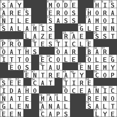 ACROSS 1. Declare 4. Method 8. Part of HMS, perhaps 11. Ancient Greek god of war 13. Greek god of love 14. Israeli folk dance 15. Mediterranean tributary 16. Backtalk 17. Mine, in Marseilles 18. Deli grouping 21. American astronaut and politician John 22. Goldbrick 23. Actress Charlotte 25. Fast jet (abbr.) 26. Adept person 29. A testis 32. Expletives 34. Boat paddle 35. Soap unit 38. "Tell ____ the Marines!" 39. Learning spot: Fr. 41. Cassini of fashion 43. Greek goddess of the dawn 44. The 19th letter of the Greek alphabet 45. Foe 46. Plea 50. Police officer (slang) 51. Perceive with the eye 54. Feline 55. Hoop that covers a wheel 57. Potato state 59. Pertaining to the sea 63. Nathan's nickname 64. Promenade 67. Western Nevada city 68. Small, secluded valley 69. Of or related to the anus 70. Table seasoning 71. Car or cant ending 72. Balmoral and tarboosh 73. Sodium hydroxide DOWN 1. Without 2. Operatic vocal solo 3. Shout 4. Makes clutter 5. Mouth or opening 6. Two (Sp.) 7. Double-curved letter 8. Residences 9. Metal shackles 10. Inhabitant of Heaven 12. Lick closed 14. Actor Linden 19. Floor protectors 20. Ending with capital 21. Set 23. Monetary unit of Yemen 24. 1/640 square mile 26. Luau course 27. Pace 28. "Beetle Bailey" pooch 30. Woman's close-fitting hat 31. Inky black, to poets 33. Flexible conduit 36. Actor Baldwin 37. San ____ (Riviera town) 39. Singer James 40. Haul 42. Swindle 45. Jane of fiction 47. Non-commissioned officer (abbr.) 48. Ringlike coral islands and reefs 49. Nervous spasm 51. Burn superficially 52. Peak District village in England 53. Consumed 56. Hearing organs 58. Layer 60. Actress Patricia 61. Inwardly 62. ____ d'Azur (French Riviera) 64. Big _ 65. Santa ___, CA 66. Pet locale