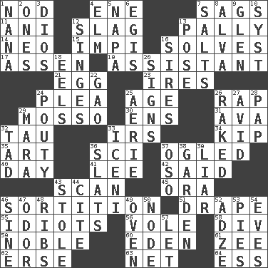ACROSS 1. Lower and raise head in agreement 4. Compass dir. 7. Droops 11. Cuckoo 12. Volcanic refuse 13. Friendly 14. Modern: prefix 15. Body of Kaffir warriors 16. Finds the solution 17. NE Netherlands city 19. Helper 21. Oval reproductive body of a fowl 23. Angers 24. Entreaty 25. Personal question 26. Hit sharply and swiftly 29. With motion or animation 30. Followers of ems 31. Actress Gardner 32. The 19th letter of the Greek alphabet 33. Big collection agency 34. Sleep 35. Nonscientific branch of learning 36. _-fi 37. Stared at amorously 40. 24 hours 41. Area sheltered from the wind 42. Alleged 43. Skim 45. Mouth or opening 46. Drawing lots 51. Window treatment 55. Foolish or stupid persons 56. Short-tailed, large-bodied rat 58. HTML Container Element 59. Having high moral qualities 60. Locale of original sin 61. Last letter of the English alphabet 62. Celtic language 63. Fish or hair follower 64. Curvy letter DOWN 1. Nanny 2. Singles 3. "Vaya con ____" 4. Shade tree 5. California wine valley 6. Armor plate that protects the chest 7. Table seasonings 8. Inventor's middle name 9. Small, secluded valley 10. System (abbr.) 12. Scorches 13. Introduce or present, as a question 16. Begets 18. Snakelike fish 20. Signals 22. E Mali city 24. Inclined to pout 25. Nest on high 26. Swept the length of 27. Enthusiastic 28. Infant food 29. Hindu Mythology: god of death 32. Small boy 33. Ancient Celtic tribe of eastern Britain 36. Narrow boards 37. Bear (Spanish) 38. Place where plants grow 39. One who doesn't tell the truth 43. Took without asking 44. Quote 46. Trig term 47. Aroma 48. Teases 49. Baking chamber 50. Connecting point 52. Axlike tool, used for shaping wood 53. Sliced desserts 54. Nights before holidays 57. Allow