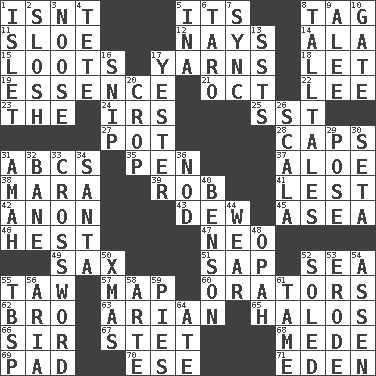 ACROSS 1. Is not 5. ___ a Wonderful Life 8. Label 11. A type of plum 12. Negative votes 14. Insect wing 15. Plunders 17. Tall tales 18. Allow 19. Gist 21. Sep. follower 22. Area sheltered from the wind 23. Definite Article 24. Big collection agency 25. Fast jet (abbr.) 27. Plant holder 28. Balmoral and tarboosh 31. Lettered men learn these first 35. Writing instrument 37. Medicinal plant 38. Hindu Mythology: god of death 39. Director Reiner 41. For fear that 42. At once, immediately (arch.) 43. Morning condensation 45. At sea 46. Behest 47. Modern: prefix 49. Saxophone 51. Plant excrement 52. Ocean 55. The 23rd letter of the Hebrew alphabet 57. Atlas unit 60. Speakers 62. Sis' sibling 63. Believer in; advocate of (suffix) 65. Radiant circles of light 66. Title for a knight 67. Proofreading order 68. Ancient Persian 69. Writing tablet 70. Compass dir. 71. Genesis locale DOWN 1. Small island 2. Make a splashing sound 3. Trap for birds or small mammals 4. False hair 5. _ tizzy (2 wds.) 6. Edible starchy tuberous root 7. Synchronize (abbr.) 8. Baron Munchausen's specialties 9. Toward shelter 10. Yard entry 13. Fast planes 16. Sever or remove by pinching or nipping 17. Of or pertaining to yesterday 20. Riding implement 26. Any of the three canals of the cochlea 29. Airs 30. Stalk of a moss capsule 31. Wet nurse 32. Object of repulsion 33. What you're doing now 34. Before Barbara or Clara 36. Allow head to fall sleepily 40. Gillaume's butler role 44. Erode 48. Brightly colored fish 50. Dec. holiday 52. Having a sole or soles 53. Eat (away) 54. NE Netherlands city 55. Cook's measure (abbr.) 56. Roberta Peters solo 58. Johnson of "Laugh-In" 59. Sliced desserts 61. Docile 64. Had dinner
