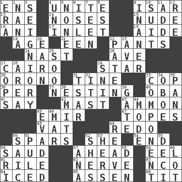 ACROSS 1. Followers of ems 4. Join together 9. Astrian river, tributary to the Danube 13. Actress Charlotte 14. Olfactory organs 15. Naked 16. Cuckoo 17. An arm off of a larger body of water 18. Helper 19. Grow older 21. Car or cant ending 22. Leg coverings 24. Political cartoonist Thomas 26. "___ Maria" 27. Capital of Egypt 29. Play the lead 30. U. of Maine site 31. Prong on a fork 33. Police officer (slang) 36. For each 37. Nestling 40. Chief or king in Benin or Nigeria 41. Declare 42. Vertical spar for supporting sails 43. ID or VA city 45. Arab leader 47. Drinks excessively 48. Large container 49. Redecorate 50. Practice fights 52. A female animal or person 54. Conclusion 56. Saudi Arabian king (1953-1964) 57. At or in the front 59. Snakelike fish 61. Cause heat under the collar 62. Boldness 63. Non-commissioned officer (abbr.) 64. On the rocks 65. NE Netherlands city 66. Teat (slang) DOWN 1. Period 2. Nanny 3. Signiory (variant) 4. Corn or form start 5. Music written for nine 6. Small island 7. Adolescent 8. Eastern Standard Time (abbr.) 9. More lacking in sense or substance 10. Set of matching outer garments 11. Sums up 12. Portuguese money of account (variant) 20. Merit 22. Eucharist need 23. Actress Gardner 25. Within a short period 27. 911 reaches them 28. Length times width 29. In a ____ (agitated or irritated) 31. Russian ruler of old 32. ___ a Wonderful Life 33. Part 34. Mitch Miller's instrument 35. Baking dishes 38. Sends forth 39. Yard entry 44. Method 45. Eluded 46. Third mo. 49. Break or tear apart 50. Ketch in the Levant 51. Whimper 52. "______ My Girl" (Turtles hit) 53. Possessive pronoun 55. Tenth: prefix 56. Indian title of respect (Mr.) 57. Santa ___, CA 58. Lair 60. Car dealer's back yard