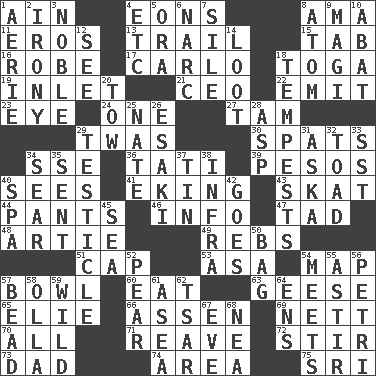 ACROSS 1. The 18th letter of the Arabic alphabet 4. Immeasurably long periods of time 8. Nursemaid (var.) 11. Greek god of love 13. Lag or linger behind 15. Bar bill 16. Loose flowing garment 17. Monte _, Las Vegas Hotel/Casino 18. Ancient Roman robe 19. An arm off of a larger body of water 21. Corporate head (abbr.) 22. Send forth 23. Sight organ 24. Single 27. Scottish cap 29. It was, poetically 30. Arguments over trivial matters 34. Compass dir. 36. Jacques of French films 39. Mexican monetary units 40. Observes 41. Supplementing with great effort 43. Three-handed card game 44. Leg coverings 46. A message received and understood 47. Small amount or degree 48. Nick name for Arthur 49. Confederate soldiers (slang) 51. Head covering 53. White ___ sheet 54. Atlas unit 57. Soup holder 60. Erode 63. Honkers 65. Writer Wiesel 66. NE Netherlands city 69. Remaining after all deductions 70. Everything 71. Rob, plunder, or pillage 72. Tumult 73. June honoree 74. Type of rug 75. Indian title of respect (Mr.) DOWN 1. Nest on high 2. Literary sarcasm 3. Impressive in appearance 4. And so on (abbr.) 5. Mouth or opening 6. Drug cop 7. Filth; sediment 8. Smallest unit of an element 9. Wise men 10. Blind as ____ 12. Observe 14. Plunder 18. Storms 20. Pull behind 25. Nathan's nickname 26. 1973 Nobel Price Winner (Physics) Leo 28. Cleo's killer 29. A testis 31. "____ silly question..." 32. Frog relative 33. Fast jet (abbr.) 34. Singe 35. Emitted 37. Metal container 38. Kind of red light 40. Health resort 42. Moves 45. Ocean 50. Paper or plastic container 52. Lightbulb-shaped fruit 54. Confronts 55. Being in motion 56. _ dish (used to culture cells) 57. Necklace unit 58. Rounded earthenware pot or jar 59. Rampant 61. Toward the sea 62. Russian ruler of old 64. Followers of ems 67. Night before a holiday 68. Teachers' org.