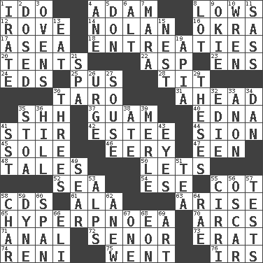 ACROSS 1. Wedding promise 4. First man 8. Moos 12. Be footloose 14. Pitcher Ryan 16. Gumbo ingredient 17. At sea 18. Pleas 20. Portable shelters 22. Viper 23. Followers of ems 24. Begley and Asner 25. Suppuration 28. Teat (slang) 30. Edible starchy tuberous root 31. Toward the future 35. Quiet! 37. Island territory of the United States 40. Pulitzer Prize-winning author Ferber 41. Tumult 42. First name in cosmetics 44. The Jewish people; Israel 45. Flatfish 46. Suggestive of the supernatural 47. Car or cant ending 48. Lies 50. Allows 52. Ocean 54. Compass dir. 55. Small bed 58. Music discs 61. In the manner of 63. Ascend 65. Abnormally rapid or deep breathing 70. Curves 71. Of or related to the anus 72. Sir (Sp.) 73. Part of Q.E.F. 74. Painter Guido (1575-1642) 75. Gone 76. Big collection agency DOWN 1. Feeling or showing extreme anger 2. Administered medicine 3. Baking chambers 4. A saturated hydrocarbon 5. Spanish title 6. The first octave above the treble staff 7. Hindu Mythology: god of death 8. Car dealer's back yard 9. Migrant worker of the '30s 10. Songbird 11. Backtalk 13. Erode 15. A home for chicks 19. Capital of Western Samoa 21. Health resort 26. Goad 27. Boozer 29. College papers 30. Triplets 32. Singer Brickell 33. At once, immediately (arch.) 34. Daniel's nick name 35. Portico 36. Land elevation 38. Had dinner 39. Haggard of country music 41. Fast jet (abbr.) 43. Sight organs 49. Shrivel 51. Afternoon social gathering 53. High mountains 55. High-altitude cloud 56. Witty Wilde 57. Trials 58. Burn to charcoal 59. Centimeter-gram-second unit of force 60. Connect, as a bridge 62. Afresh 64. Actress Charlotte 66. Connecticut Ivy Leaguer 67. Single 68. Age 69. Nonscientific branch of learning