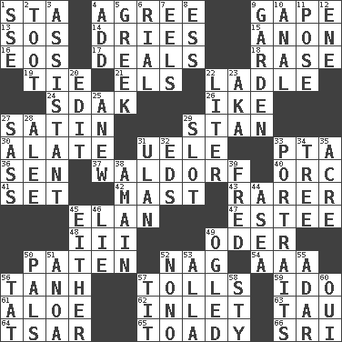 ACROSS 1. R.R. building 4. Match 9. Yawn 13. Distress signal 14. Frees from moisture 15. At once, immediately (arch.) 16. Greek goddess of the dawn 17. Allots cards 18. To erase 19. Standoff 21. Raised railways 22. Dipping utensil 24. Neighbor of Neb. 26. D.D.E's nickname 27. Smooth fabric 29. Comedian Laurel of Laurel & Hardy 30. Having winglike extensions 31. Ubangi River tributary 33. Parent Teacher Assoc. 36. Elected rep. 37. Apple salad 40. The grampus (Milton) 41. Arrange properly for use 42. Vertical spar for supporting sails 43. Less widely known 45. Liveliness 47. First name in cosmetics 48. One more than two 49. Baltic tributary 50. Eucharist need 52. Tired old horse 54. Auto club (abbr.) 56. Hyperbolic tangent 57. For Whom the Bell _____ 59. Wedding promise 61. Medicinal plant 62. An arm off of a larger body of water 63. The 19th letter of the Greek alphabet 64. Russian ruler of old 65. Sycophant 66. Indian title of respect (Mr.) DOWN 1. Compass dir. 2. A blast of a horn 3. Aide 4. Find the sum of 5. Of Greece 6. Monetary unit of Yemen 7. Snakelike fish 8. Curvy letter 9. Place where plants grow 10. Of or related to the anus 11. Introduce or present, as a question 12. Compass dir. 20. Prepare for publication 22. 61 cubic inches 23. Alias (abbr.) 25. Afresh 27. Backtalk 28. Toward shelter 29. Narrow, elongated depression 31. ____ Bator 32. Begley and Asner 33. Likenesses of persons 34. Family _ (genealogy) 35. 1/640 square mile 38. At full speed 39. Flintstone 44. Toward the sea 45. One or the other 46. Falsehood 49. Stared at amorously 50. Friends 51. Small Philippine buffalo 52. Words to Nanette 53. Silent film actress Nazimova 55. The sixth month of the Jewish calendar 56. Make lace 57. Teat (slang) 58. Filthy place 60. Fr. "Yes"