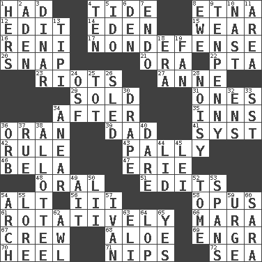 ACROSS 1. Possessed 4. Periodic rise and fall of the sea level 8. Inactive volcano in Sicily 12. Prepare for publication 14. Genesis locale 15. Put on (as clothing) 16. Painter Guido (1575-1642) 17. Unrelated to defense, as in spending 20. Fastener 21. Mouth or opening 22. Parent Teacher Association (abbr.) 23. Debaucheries 27. Singer Murray 29. Disposed of to a purchaser 31. Washington bills 34. Following 35. Lodging establishments 36. NW Algerian seaport 39. June honoree 41. System (abbr.) 42. General guideline 43. Friendly 46. Actor Lugosi 47. One of the Great Lakes 48. Of the mouth 51. Prepares for publication 54. The first octave above the treble staff 56. One more than two 58. Musical composition 61. Happening in regular succession 66. Hindu Mythology: god of death 67. Ship's personnel 68. _ vera 69. Engineer (abbr.) 70. The bottom of a shoe or boot 71. Cuts off 72. Ocean DOWN 1. Possessive pronoun 2. Arabian gulf 3. Middle Eastern gold or silver currency 4. Nine, plus one 5. Wedding promise 6. Lair 7. Inside; within (prefix) 8. She-sheep 9. 3-inch nail 10. Political cartoonist Thomas 11. Type of rug 13. Native american tent (variation) 18. Epoch 19. Air blower 24. Order of Saint Francis (abbr.) 25. Small child 26. Downhill vehicle 28. Annoyingly loud 30. Window treatment 32. Followers of ems 33. Fast jet (abbr.) 34. Approach 36. Globe 37. Sorrow 38. One to whom something is allotted 40. Have the gumption 44. Flaplike covering 45. Luau accessory 49. Small island 50. Cards in a Roman deck? 52. Heavy book 53. Connects, as a bridge 54. Bowlike part 55. Old wives' tales, e.g. 57. _ the terrible 59. Goad 60. "Two Mules for Sister ____" 62. Leather borer 63. Connecticut Ivy Leaguer 64. Chop off 65. Affirmative reply
