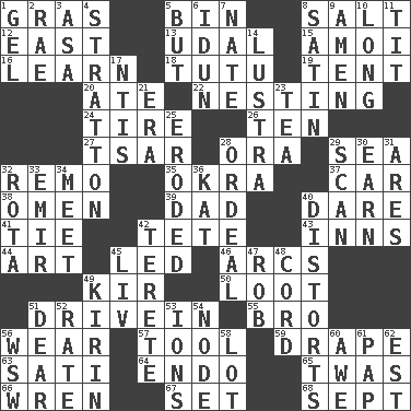 ACROSS 1. Pate de foie ____ 5. Storage container 8. Table seasoning 12. 90 degrees 13. Freehold land 15. Mine, in Marseilles 16. Acquire or gain knowledge or skills 18. Ballerina skirt 19. Portable shelter 20. Had dinner 22. Inhabiting a nest 24. Become fatigued 26. Nine, plus one 27. Russian ruler of old 28. Mouth or opening 29. Ocean 32. San ____ (Riviera town) 35. Gumbo ingredient 37. Auto 38. Sign of something about to happen 39. June honoree 40. Have the gumption 41. Standoff 42. Wig 43. Lodging establishments 44. Tate display 45. Directed 46. Arches 49. Apertif with cassis 50. Plunder 51. Popular '50s hangout 55. Sis' sibling 56. Erode 57. Implement 59. Window treatment 63. Suttee (variant) 64. Inside; within (prefix) 65. It was, poetically 66. Songbird 67. Arrange properly for use 68. Back-to-school mo. DOWN 1. Set 2. Actress Charlotte 3. White ___ sheet 4. Ski resort town in Vermont 5. On the contrary 6. Goddess of spring and wife of Bragi 7. Nathan's nickname 8. Smooth fabric 9. So be it 10. Having great length 11. Teat (slang) 14. A period of five years 17. Nuclear Threat Initiatives 21. Epoch 23. Afternoon social gathering 25. Eaten away 28. Severe or trying experience 29. Examine hastily 30. Merit 31. Ancient Greek god of war 32. Round or rotation of duties 33. Independent ruler or chieftain 34. Rendezvous 36. Krazy ___ of comics 40. What propaganda does 42. Cigar-shaped 45. 54 in ancient Rome 47. Director Reiner 48. Drawstring 49. Japanese brewing company 51. Letter starter 52. Assign a rank or rating to 53. Charged atoms 54. Thickened enlargement 56. Compass dir. 58. Car dealer's back yard 60. Deep reverence 61. Infant food 62. Eastern Standard Time (abbr.)
