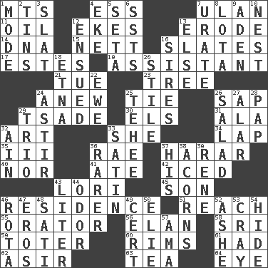 ACROSS 1. Mountains (abbr.) 4. Curvy letter 7. ____ Bator, Mongolia 11. Petroleum 12. Makes supply last 13. Eat (away) 14. Heredity factor (abbr.) 15. Remaining after all deductions 16. Chalkboards 17. _____ Park, CO 19. Aide 21. Third day of the wk. 23. Woody plant 24. Afresh 25. Make a knot 26. Plant excrement 29. Sadhe (variant) 30. Raised railways 31. According to 32. Tate display 33. A female animal or person 34. Pet locale 35. One more than two 36. Actress Charlotte 37. Ethiopian city, capital of Harari 40. Or not 41. Had dinner 42. On the rocks 43. Australian parrot (variant) 45. Male child 46. Home 51. Arrive at 55. Speaker 56. Style 58. _ Lanka 59. Carrier 60. Basketball hoops 61. Possessed 62. SW Saudi Arabia district 63. Afternoon social gathering 64. Sight organ DOWN 1. Method 2. Canisters 3. Narrow board 4. Make supply last 5. Stalk of a moss capsule 6. Fast planes 7. A salt of uric acid 8. Globular water bottle used in Asia 9. An important port of Yemen 10. Egg locale 12. Took place subsequently 13. Otherwise 16. Founders of families 18. Inactive volcano in Sicily 20. Vertical member of a panel or frame 22. She-sheep 24. Moving or stirring 25. Giggle 26. First course 27. Having or resembling wings 28. Infant food 29. Musical group of three 32. The 18th letter of the Arabic alphabet 33. Smooth fabric 36. Less widely known 37. Part of HMS, perhaps 38. Oak nuts 39. French philosopher Descartes 43. 61 cubic inches 44. Scent 46. Roll call or roster of names 47. Greek god of love 48. Suttee (variant) 49. An absolute certainty 50. Writer Wiesel 52. American tennis player Robert 53. Supercomputer manufacturer 54. Flintstone garb 57. Wet nurse (var.)