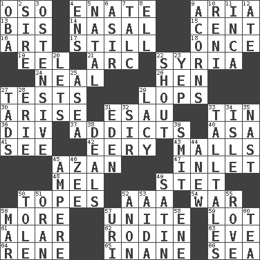ACROSS 1. Bear (Spanish) 4. Related on the mother's side 9. Roberta Peters solo 13. Twice 14. Relating to the nose 15. Penny 16. Tate display 17. Free of sound 18. At one time in the past 19. Snakelike fish 21. Curve 22. Damascus' land 24. Be tempered by heat 26. Layer 27. Trials 29. Chops off 30. Ascend 31. He sold his birthright 33. Shallow baking pan 36. HTML Container Element 37. Inveterate users 40. White ___ sheet 41. Observe 42. Suggestive of the supernatural 43. Promenades 45. Muslim summons to prayer 47. An arm off of a larger body of water 48. Cartoonist voice _ Blanc 49. Proofreading order 50. Drinks excessively 52. Auto club (abbr.) 54. Armed conflict 56. Greater amount 57. Join together 59. Car dealer's back yard 61. Having or resembling wings 62. "The Thinker" sculptor 63. Night before a holiday 64. French philosopher Descartes 65. Lacking in sense or substance 66. Ocean DOWN 1. Chief or king in Benin or Nigeria 2. The founder of a family 3. Clearly or manifestly demonstrative 4. Followers of ems 5. Relating to or accompanying birth 6. SW Saudi Arabia district 7. Baby powder 8. Pipe bend 9. Oak nuts 10. Painter Guido (1575-1642) 11. South American Indian 12. Had dinner 20. Allows 22. Yell 23. Slangy assent 25. Toward the sea 27. Small amounts or degrees 28. One of the Great Lakes 29. Made of lace 31. Paradise 32. Title for a knight 33. Baron Munchausen's specialties 34. Small island 35. Political cartoonist Thomas 38. Allots cards 39. Stricken, poetically 44. Afresh 45. Electrical Unit 46. Last letter of the English alphabet 49. Smooth fabric 50. Lacquered or enameled metalware 51. Northwest Algerian city 52. Soon (poet.) 53. Opera by Verdi 55. Be footloose 56. Third mo. 57. RI univ. 58. Compass dir. 60. Beverage made from leaves