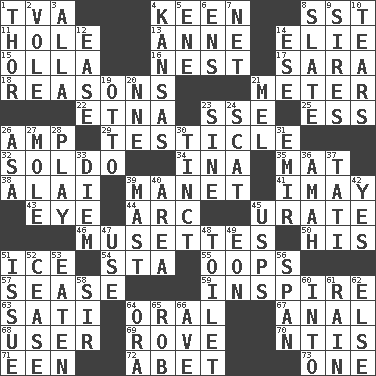 ACROSS 1. Federal power corp. 4. Peachy ____! 8. Fast jet (abbr.) 11. Hollow 13. Singer Murray 14. Writer Wiesel 15. Spanish pot 16. Egg locale 17. "Two Mules for Sister ____" 18. Thinks logically 21. Distance measurement 22. Inactive volcano in Sicily 23. Compass dir. 25. Curvy letter 26. Electrical Unit 29. One of the two male reproductive glands 32. Twentieth part of a lira 34. _ tizzy (2 wds.) 35. Floor protector 38. Mountain range southwest of Kyrgyzstan 39. French painter Edouard 41. "If ____ say so..." 43. Sight organ 44. Curve 45. A salt of uric acid 46. French bagpipes 50. Part of HMS, perhaps 51. Frozen water 54. R.R. building 55. I made a mistake 57. Gospel singer Marvin 59. Stimulate to action 63. Suttee (variant) 64. Taken by mouth 67. Of or related to the anus 68. One who uses or employs something 69. Be footloose 70. Nuclear Threat Initiatives 71. Car or cant ending 72. Collude with 73. Single DOWN 1. Son of Odin 2. Short-tailed, large-bodied rat 3. Silent film actress Nazimova 4. Sunflower state 5. Compass dir. 6. Followers of ems 7. Fish or hair follower 8. Chalkboard 9. Fathers 10. Lacerates 12. Relaxation 14. Compass dir. 19. Von Bismarck 20. Compass dir. 21. Cartoonist voice _ Blanc 23. Trig term 24. Jazz singing style 26. White ___ sheet 27. Undercover agent 28. Live dramatic performance 30. A color or tint 31. Arab leader 33. South Vietnam president (1954) 36. Nursemaid 37. Jacques of French films 39. Vertical spar for supporting sails 40. Type of rug 42. It is so 45. United States Postal Service (abbr.) 47. Purpose 48. Bathroom 49. Period of immesurable duration 51. Come out of 52. Stop 53. Eroded 56. Connect, as a bridge 58. Title for a knight 60. To the inside or interior of 61. Precipitation 62. Otherwise 64. Mouth or opening 65. Director Reiner 66. "___ Maria"