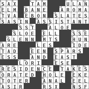 ACROSS 1. Saxophone 4. Scottish cap 7. Uhlan (variant) 11. Shade tree 12. Object of repulsion 13. Scent 14. Federal power corp. 15. Inky black, to poets 16. Chalkboards 17. Indian antelope 19. Helper 21. Fast jet (abbr.) 23. _ vera 24. _ gin 25. Pipe bend 26. Compass dir. 29. American astronaut and politician John 30. Mountains (abbr.) 31. Attila the _ 32. "We ___ not amused" (Victoria) 33. French article 34. Binary compound 35. Bit 36. Car or cant ending 37. Practice fights 40. Double-curved letter 41. Also 42. 90 degrees 43. Australian parrot (variant) 45. Compass dir. 46. Home 51. Proceeds 55. Declaimed 56. Opening into or through something 58. Supplement with great effort 59. Carrier 60. Of or related to the anus 61. Snakelike fish 62. SW Saudi Arabia district 63. Acura sports coupe 64. Overdraft (abbr.) DOWN 1. Puts into a specified state 2. Inventor's middle name 3. Dec. holiday 4. Bar bill 5. Small Philippine buffalo 6. Not women's 7. A salt of uric acid 8. Globular water bottle used in Asia 9. So be it 10. Political cartoonist Thomas 12. Gillaume's butler role 13. In addition 16. Beverly of Met fame 18. Small island 20. Table seasonings 22. Nine, plus one 24. Bobsleighs 25. Make improvements or corrections to 26. Chest covering 27. Beer foam 28. Compass dir. 29. Pate de foie ____ 32. Had dinner 33. Soviet premier 1918-24 36. Having ears or earlike features 37. Observe 38. Soft color 39. Toward the sea 43. 61 cubic inches 44. River in Europe 46. Round or rotation of duties 47. Greek god of love 48. Suttee (variant) 49. Burn to charcoal 50. Immeasurably long periods of time 52. Peachy ____! 53. Supplements with great effort 54. Itself 57. Not strict