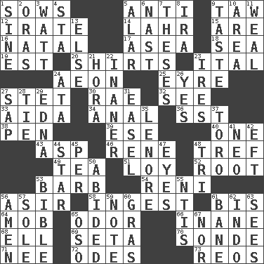 ACROSS 1. Sty mamas 5. Opposed to 9. The 23rd letter of the Hebrew alphabet 12. Feeling or showing extreme anger 14. Cowardly lion portrayer 15. "We ___ not amused" (Victoria) 16. Brizilian seaport 17. At sea 18. Ocean 19. Eastern Standard Time (abbr.) 20. Chest coverings 23. Slanted text style (abbr.) 24. Period of immesurable duration 25. Jane of fiction 27. Proofreading order 30. Actress Charlotte 32. Perceive with the eye 33. Opera by Verdi 34. Of or related to the anus 36. Fast jet (abbr.) 38. Animal enclosure 39. Compass dir. 40. Single 43. Cleo's killer 46. French philosopher Descartes 48. Not kosher 49. Beverage made from leaves 51. Myrna of the movies 52. Carrot, for example 53. Sharp remark 54. Painter Guido (1575-1642) 56. SW Saudi Arabia district 58. Swallow 61. Altar cloth linen 64. Disorderly crowd 65. Aroma 66. Silly 68. Pipe bend 69. Stalk of a moss capsule 70. Something which is sent 71. Born 72. Lyric poems 73. Vintage cars DOWN 1. Trig term 2. Mouths or openings 3. Electrical Unit 4. R.R. building 5. Having or resembling wings 6. Political cartoonist Thomas 7. College papers 8. Retirement account (abbr.) 9. Clothes sense 10. Type of rug 11. Welt 13. Otherwise 21. Israeli folk dance 22. More empty; more void 23. Angers 24. "One Day ___ Time" 26. Affirmative reply 27. Plant excrement 28. Make a knot 29. Pulitzer Prize-winning author Ferber 31. Artist's stand 35. Poe poem 37. "Corrida" creature 41. Modern: prefix 42. Lizard (obsolete) 44. Play the lead 45. For each 47. Snake ____ (dice throw) 48. Three (prefix) 50. Remained 53. God's Word 55. Nuclear Threat Initiatives 56. So be it 57. Not divided or shared with others 59. Short letter 60. Pate de foie ____ 61. Object of repulsion 62. _ china 63. Observes 65. Bear (Spanish) 67. Or not