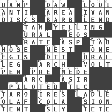ACROSS 1. Moist 5. Fool 8. Farming town in central California 12. Against 13. Type of rug 15. "Terrible" tsar 16. Flat circles 18. Sharp remark 19. Grant temporary use of 20. Scottish cap 22. Crying or shouting loudly 24. Mountain range 26. Greek goddess of the dawn 27. Assign a rank or rating to 28. Viper 29. Keyboard key 32. Stockings 35. A home for chicks 37. Single 38. The front part of a cuirass 39. Baseball player Mel 40. Of the mouth 41. Part of a journey 42. Bowlike part 43. Electrical Unit 44. Fenced enclosure 45. Before (prefix) 46. Ancient Persian 49. Curve 50. SW Saudi Arabia district 51. Manned the helm 55. Affectionate concern, for short 56. Pacific island yam 57. Angers 59. Dipping utensil 63. Norwegian king 64. Root beer relative 65. The Jewish people; Israel 66. Portable shelter 67. Mischievous 68. Wig DOWN 1. June honoree 2. Black tropical American cuckoo 3. Mountains (abbr.) 4. Photos 5. Pat or tap gently 6. Like ___ of sunshine 7. Past tense of be (plural) 8. Ms. Damita and namesakes 9. Baking chamber 10. Mild oath, euphamism for damn 11. Working for oneself (abbr.) 14. Most capable 17. "Two Mules for Sister ____" 21. Floor protector 23. Chop off 25. Poe poem 28. Respiratory problem 29. "Corrida" creature 30. Of or related to the anus 31. Waist strap 32. Aid 33. Double curve, resembling the letter S 34. Attach a signature 36. And so on (abbr.) 40. Cloudy 42. Northern region 45. Adept person 47. Eastern Standard Time (abbr.) 48. Deli pickle 49. Upward 51. Diluted with white 52. SW Asia republic 53. Greek god of love 54. Small valley 56. Small child 58. Declare 60. Pass on 61. Car dealer's back yard 62. Compass dir.