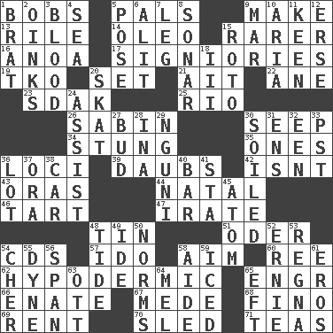 ACROSS 1. Moves up and down 5. Friends 9. Create 13. Cause heat under the collar 14. Margarine 15. More uncommon 16. Small Philippine buffalo 17. Seigniories (variant) 19. Ring climax 20. Put into a specified state 21. Small island 22. A saturated hydrocarbon 23. Neighbor of Neb. 25. River (Sp.) 26. Unit of acoustic absorption 30. Ooze 34. Feeling sharp psychological pain 35. Singles 36. Event scenes 39. Applies to a surface 42. Is not 43. Mouths or openings 44. Brizilian seaport 46. Small pie 47. Feeling or showing extreme anger 48. Metal container 51. Baltic tributary 54. Music discs 57. Wedding promise 58. Direct toward a target or goal 60. Portuguese money of account (variant) 62. Subcutaneous 65. Engineer (abbr.) 66. Related on the mother's side 67. Ancient Persian 68. A pale, very dry sherry 69. Monthly bill 70. Downhill vehicle 71. Beverages made from leaves DOWN 1. Naughty child 2. Pig sounds 3. Vital fluid 4. Ocean 5. Airs 6. Came down and settled, as after flight 7. Part of a journey 8. Echolocation 9. Third mo. 10. Operatic vocal solo 11. Peachy ____! 12. Celtic language 15. Printing process, for short 18. One more than two 20. Three-handed card game 24. Help 27. Partially opened flower 28. _ tizzy (2 wds.) 29. Group of southern Bantu languages 30. Dirtied 31. Followers of ems 32. Car or cant ending 33. Pacific Standard Time (abbr.) 36. Car dealer's back yard 37. Mouth or opening 38. 4-wheeled motor vehicle 40. Soap unit 41. R.R. building 45. Tiny particle 48. Event that recurs at intervals 49. Binary compound 50. Typical standards 52. Bert's buddy 53. Rain (Swedish) 54. "Mermaids" star 55. Centimeter-gram-second unit of force 56. Connect, as a bridge 58. Helper 59. On the rocks 61. Greek god of love 63. Baseball player Mel 64. Cartoonist voice _ Blanc 65. Newt