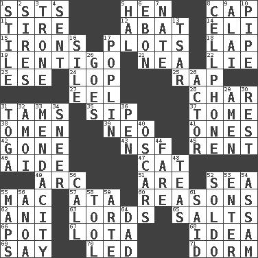 ACROSS 1. Fast planes 5. Layer 8. Head covering 11. Hoop that covers a wheel 12. Blind as ____ 14. Connecticut Ivy Leaguer 15. Removes the wrinkles 17. Secret plans 18. Pet locale 19. Small, flat, pigmented spot on the skin 21. Teachers' org. 22. Falsehood 23. Compass dir. 24. Chop off 25. Strike 27. Snakelike fish 28. Burn to charcoal 31. Scottish caps 35. Small drink 37. Heavy book 38. Sign of something about to happen 39. Modern: prefix 41. Washington bills 42. Went 43. Science/research agcy. 45. Monthly bill 46. Helper 47. Domesticated feline 49. Curve 51. "We ___ not amused" (Victoria) 52. Ocean 55. Big _ 57. _ moment's notice (2 wds.) 60. Thinks logically 62. Black tropical American cuckoo 63. Nobles 65. Table seasonings 66. Plant holder 67. Globular water bottle used in Asia 68. It may be bright or harebrained 69. Declare 70. Directed 71. Dormintory (informal) DOWN 1. Vertical member of a panel or frame 2. Titles for men of rank and authority 3. Heavy duty weighing machine 4. Transmitted 5. Actor Linden 6. Inky black, to poets 7. Nathan's nickname 8. Portable communications device 9. Jai ____ 10. Corncob 13. Russian ruler of old 16. Drop; flow; fall 17. Cotton for raincoats, e.g. 20. Travels 26. Thespian 29. So be it 30. Respite 31. Ancient Roman robe 32. Mine, in Marseilles 33. Ananias' fault 34. Scornful expression 36. Fenced enclosure 40. Motion picture awards 44. Conductor's collection 48. Afternoon social gatherings 50. Give a ring to 52. Twentieth part of a lira 53. Keyboard key 54. Indian state 55. Atlas contents 56. Small Philippine buffalo 58. Utensil 59. Johnson of "Laugh-In" 61. Alleged 64. Male parent