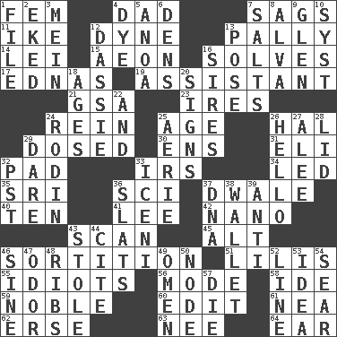 ACROSS 1. Opposite of masc. 4. Male parent 7. Sinks 11. Mamie's husband 12. Unit of force 13. Friendly 14. Flowery wreath 15. A really long time 16. Finds the solution 17. Ferber et al. 19. Aide 21. Girls' org. (abbr.) 23. Angers 24. It's straight from the horse's mouth 25. Grow older 26. Actor Linden 29. Administered medicine 30. Followers of ems 31. Connecticut Ivy Leaguer 32. Writing tablet 33. Big collection agency 34. Directed 35. Indian title of respect (Mr.) 36. _-fi 37. A sleeping potion; an opiate (poet.) 40. Nine, plus one 41. Area sheltered from the wind 42. Billionth: prefix 43. Skim 45. Keyboard modifier key 46. Drawing lots 51. Ms. Damita and namesakes 55. Foolish or stupid persons 56. Method 58. Binary compound 59. Impressive in appearance 60. Prepare for publication 61. Teachers' org. 62. Celtic language 63. Born 64. Ewer handle DOWN 1. Do some clerical work 2. Made supply last 3. Count _ (2 wds.) 4. Color 5. Small Philippine buffalo 6. Cub Scout units 7. Table seasonings 8. Inventor's middle name 9. Small, secluded valley 10. System (abbr.) 12. Hyrax 13. Introduce or present, as a question 16. Begets 18. Ripens 20. Attaches a signature 22. Added to 24. "The Thinker" sculptor 25. Nest on high 26. Phone greeting 27. Toward shelter 28. Hat (slang) 29. Have the gumption 32. Pacific Standard Time (abbr.) 33. Ancient Celtic tribe of eastern Britain 36. Narrow boards 37. Heredity factor (abbr.) 38. Place for singles 39. Opposed to 43. Took without asking 44. Quote 46. Trig term 47. Aroma 48. Chest bones 49. Presage 50. Thickened enlargement 52. Actor's bit 53. The main thing one is thinking about 54. Burn superficially 57. Pass on