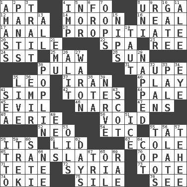 ACROSS 1. Fitting 4. A message received and understood 8. Capital and largest city of Mongolia 12. Hindu Mythology: god of death 14. Person of subnormal intelligence 16. Anneal 17. Of or related to the anus 18. Appease 20. Vertical member of a panel or frame 22. Health resort 23. To riddle 24. Fast jet (abbr.) 25. Opening into something insatiable 28. Player for Phoenix 30. Monetary unit of Botswana 31. Grayish beige 35. Lion 37. SW Asia republic 40. Live dramatic performance 41. Simple or foolish person 42. Hauls 44. Diluted with white 45. Morally bad or wrong 46. Drug cop 47. Followers of ems 48. Nest on high 50. Null 52. Modern: prefix 54. And so on (abbr.) 55. Make lace 58. ___ a Wonderful Life 61. Hat (slang) 63. Learning spot: Fr. 65. Interpreter 70. Brightly colored fish 71. False hair 72. Damascus' land 73. Haul 74. Migrant worker of the '30s 75. Filth; sediment 76. Observe DOWN 1. Collect or gather 2. Leg coverings 3. Distinguishing feature 4. Mischievous child 5. Or not 6. Away 7. I made a mistake 8. Corn or form start 9. Rump 10. Yard entry 11. Toward shelter 13. Everything 15. Cuts off 19. Pulled tight 21. Australian flightless bird 26. Came down and settled, as after flight 27. Make _____ (do battle with) 29. Slept 30. Cotton for raincoats, e.g. 32. ____ Bator, Mongolia 33. Friends 34. Sight organ 35. Moving, as bait 36. Arab leader 38. _ moment's notice (2 wds.) 39. Impudent aggressiveness 41. Ocean 43. Highlander 49. Snakelike fish 51. Frozen water 53. Lubricates 55. Traditional theme or motif 56. Having winglike extensions 57. Giggle 58. "Tell ____ the Marines!" 59. Long journey 60. Suttee (variant) 62. 24-hour periods 64. Small bed 66. Born 67. Three (prefix) 68. Petroleum 69. Actress Charlotte