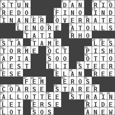 ACROSS 1. Astound 5. Daniel's nick name 8. _ de Janeiro 11. Make new 12. A pale, very dry sherry 13. Indiana (abbr.) 14. Sillier 17. Make much ado about nothing 19. Poe poem 21. Ringlike coral islands and reefs 22. Jacques of French films 23. 17th letter of the Greek alphabet 24. R.R. building 27. Docile 29. French article 32. Singer Mel 34. Sep. follower 36. Expression of disdain 37. Capital of Western Samoa 38. "Barney Miller" actor Jack 39. Von Bismarck 40. For fear that 41. Connecticut Ivy Leaguer 42. Bull 43. Compass dir. 44. Liveliness 46. To sift 47. Opposite of masc. 50. Greek god of love 52. Unrefined 55. A viewer who gazes fixedly 57. One to whom something is allotted 59. Put through a sieve 62. Flowery wreath 63. Celtic language 64. Travel on or in a vehicle 65. Car dealer's back yard 66. Distress signal 67. Afresh DOWN 1. _ Lanka 2. Nine, plus one 3. Freehold land 4. Music written for nine 5. HTML Container Element 6. Approach 7. 0 degrees 8. Monetary unit of Yemen 9. International (abbr.) 10. Lyric poems 12. Enemy 15. Related on the mother's side 16. Round or rotation of duties 18. Friend of Pooh 20. Full of chinks, cracks, or crevices 24. Showing deterioration from age 25. Drinks excessively 26. Originate 28. Learning spot: Fr. 29. 61 cubic inches 30. First name in cosmetics 31. Dinah or Pauly 33. Floor protector 35. Rest room 36. Cooking vessel 42. Derisive sound 45. Ancient river in northeast Turkey 47. Back 48. _____ Park, CO 49. Paris' subway 51. Father Junipero _ 52. Give a ring to 53. Margarine 54. Came down and settled, as after flight 55. Perceive with the eye 56. Precipitation 58. Double-curved letter 60. Binary compound 61. ___ Haven, CT